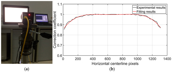 This paper uses a standard white field instrument to perform flat-field correction on the camera. Figure 2a shows the standard white field generator used for calibration. Figure 2b presents the flat-field experimental correction coefficients and their fitting results along the horizontal center line of the image (with a focal length of 35 mm and f-number of 16). The experimental results show that, due to the small f-number selected, the stable area at the center of the image is relatively large, which can reduce the impact of non-uniformity. In the actual temperature measurement process, the flat-field correction coefficients obtained during the experiment are used to correct the distortion of the optical system.