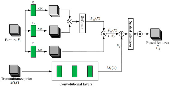 As can be seen from Figure 7, the water mist feature undergoes two parallel convolution operations. The convolution results and are subjected to element-wise multiplication, and the product is processed using the Softmax function to obtain the attention map . Subsequently, each channel of the result from the third convolution operation is multiplied with the corresponding elements of the attention map , yielding the water mist feature output by the self-attention structure. The transmittance priors of the water mist system and gas system are processed through a series of convolutional layers, resulting in the processed output . This better characterizes both the local and global features of the transmittance prior. Finally, the corresponding elements of and are subjected to a weighted summation according to the following formula: