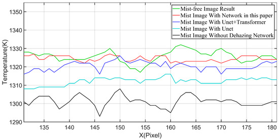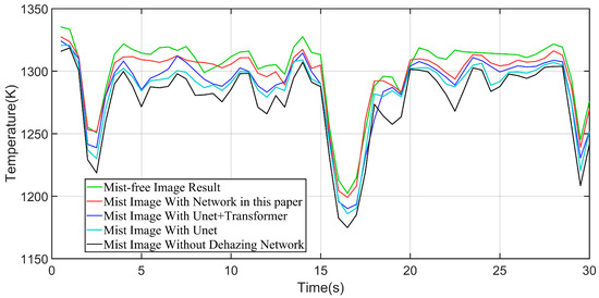 Finally, the effectiveness of image dehazing was evaluated by comparing different dehazing models using metrics such as RMSE, Maximum Temperature Difference, Average Temperature Difference, and Average Relative Error. Our results show that the proposed method outperforms other methods in terms of temperature results across various models, effectively reducing the influence of water mist on billet surface temperature measurement and demonstrating a good practical performance.