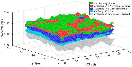 We randomly chose one set of casting billet images from the dataset and calculated and the corresponding water mist path transmittance prior. Thermal images of the billet surface temperature before and after dehazing are shown in Figure 9.