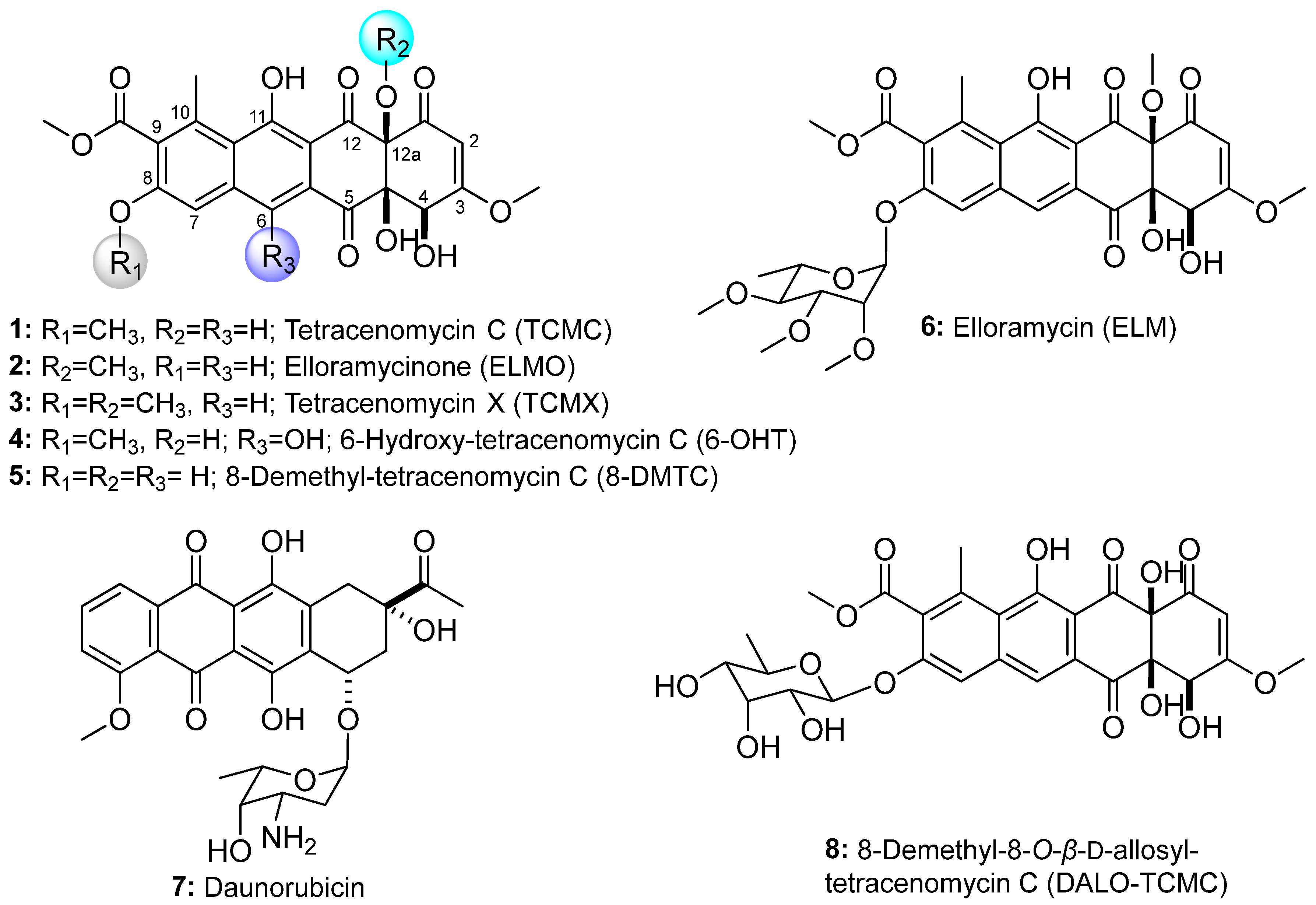 - Rohr, J.; Zeeck, A. Structure-Activity Relationships of Elloramycin and Tetracenomycin C. J. Antibiot. 1990, 43, 1169–1178. [Google Scholar] [CrossRef] [PubMed]