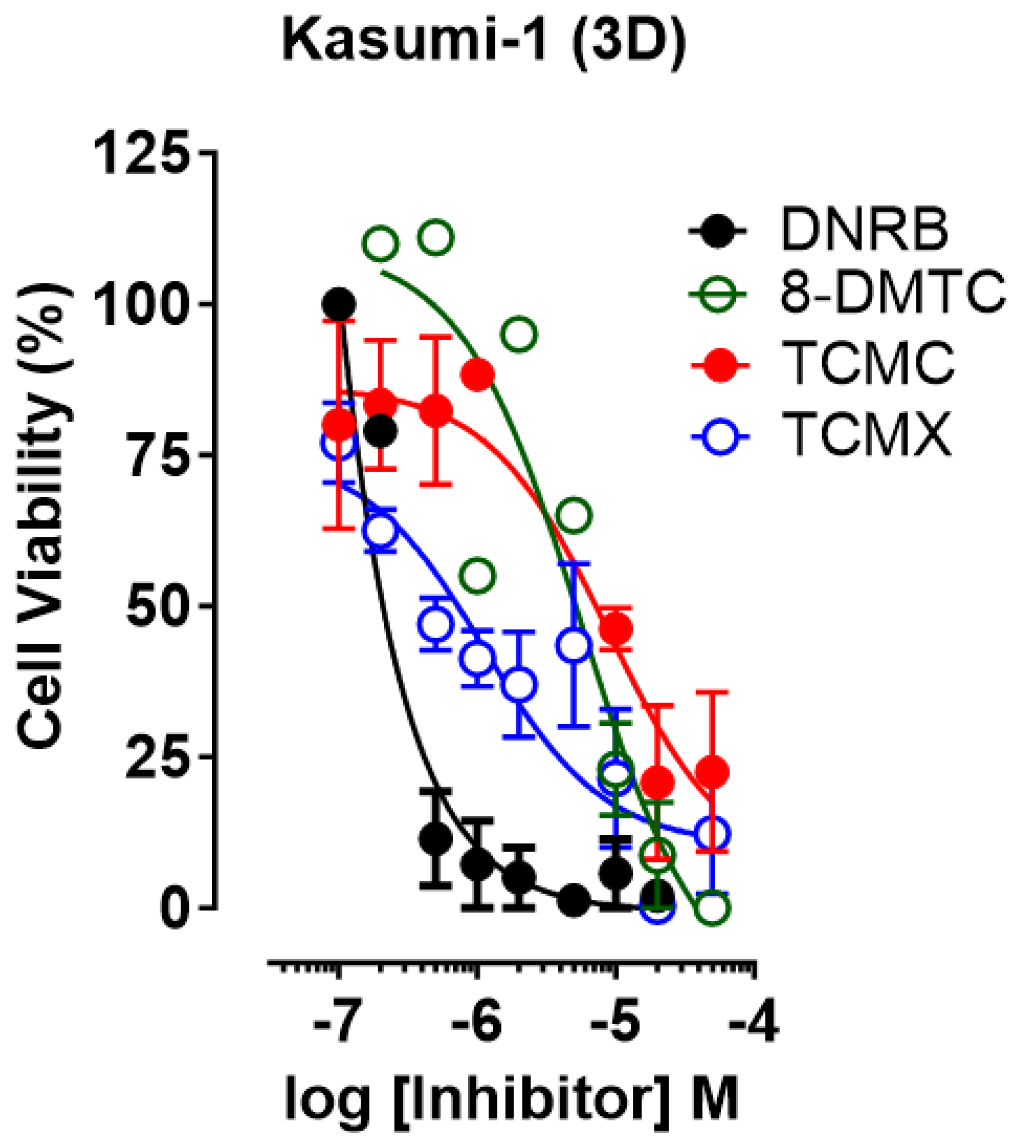 | 8-DMTC | 100.0 ± 0.0 | 37.5 ± 7.4 | 77.2 ± 0.7 | 9.2 ± 3.1 | 52.8 ± 4.3 | 23.4 ± 6.4 | 69.3 ± 2.0 | 60.4 ± 7.5 | 100.0 ± 0.0 | 12.5 ± 2.1 |