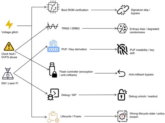 Observable: control-flow upset, MAC/tag mismatch, entropy bias, PUF BER drift, timing/power leakage.