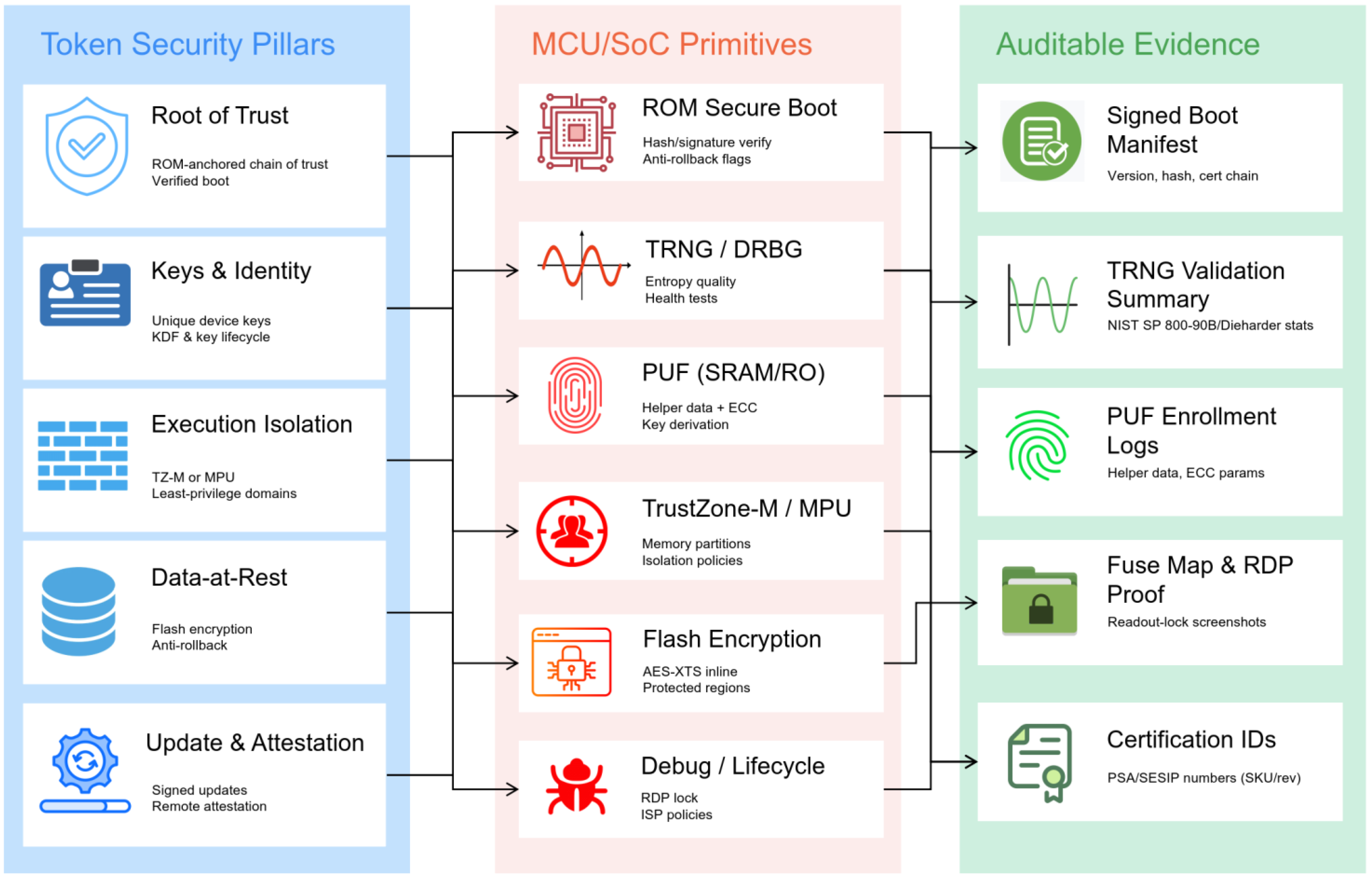 Over the past decade, security architects have increasingly relied on resource-constrained microcontrollers (MCUs)—typically Arm Cortex-M or compact RISC-V parts with features such as TrustZone-M, secure boot, flash/OTP encryption, and authenticated debug—as the primary protection boundary in IoT and token-class systems [1]. These MCUs often anchor authentication tokens and access badges and serve as roots of trust in devices whose economics favor a streamlined supply chain, a single firmware image, predictable edge latency, and aggressive platform reuse. As a result, many products now treat an MCU—not a companion secure element—as the first line of defense for boot integrity, key protection, lifecycle control, and update assurance.