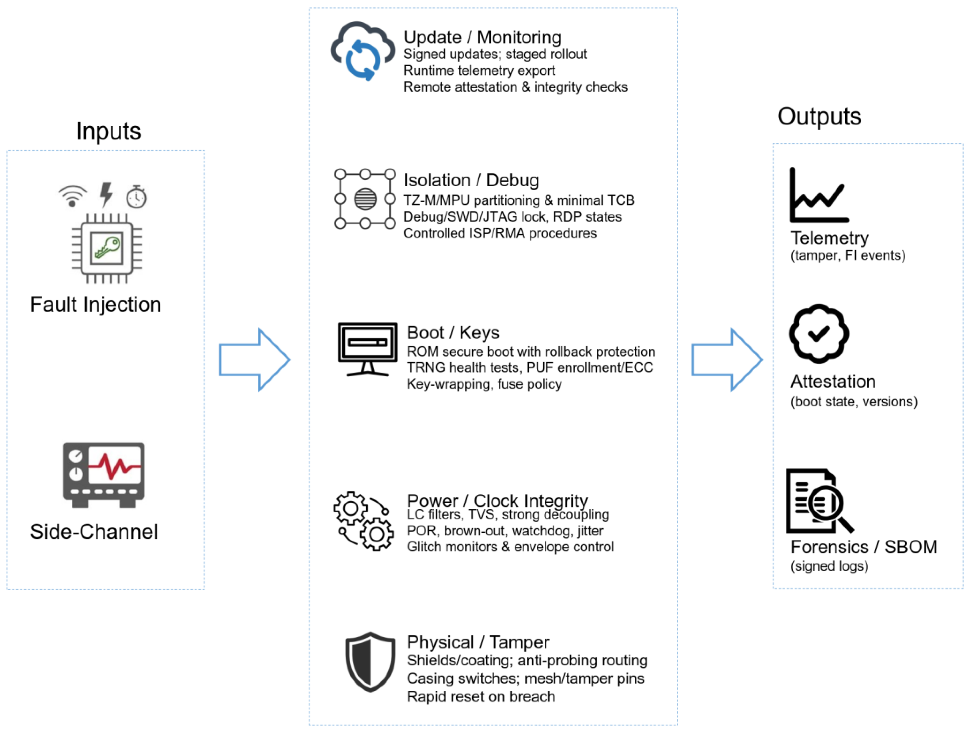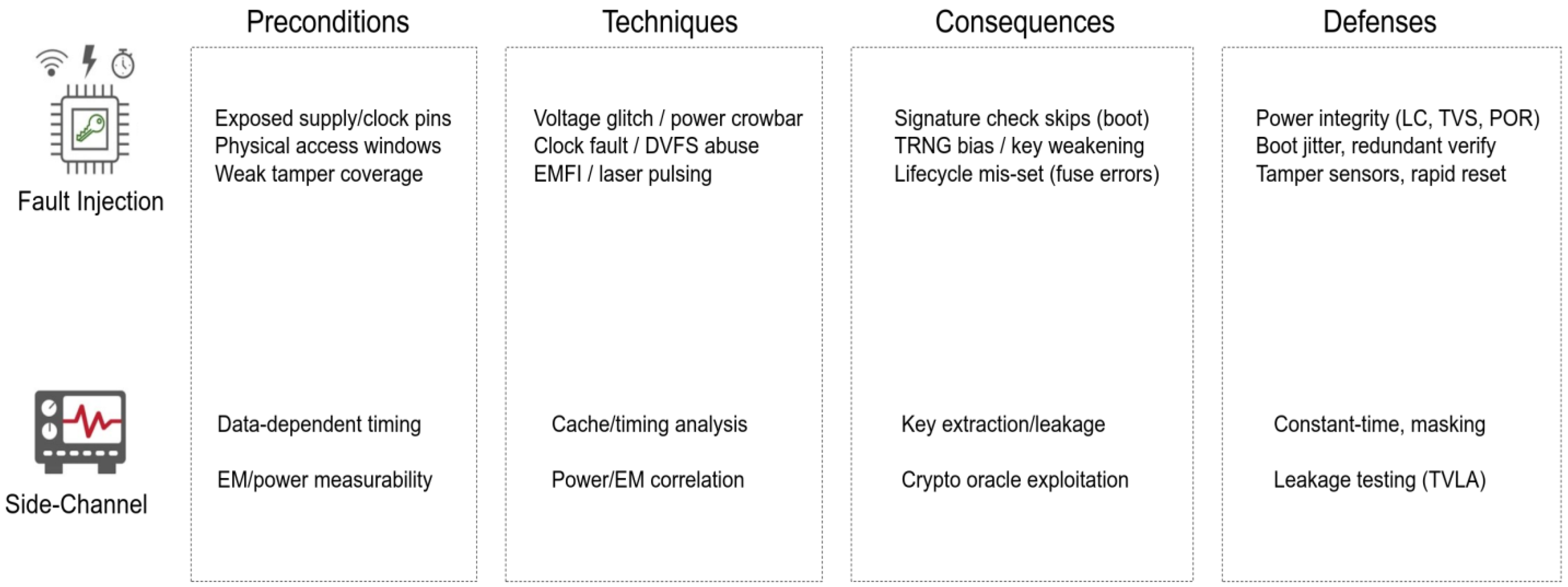 Context. Embedded settings where physical proximity and board-level conditions make FIA/SCA realistic and where silicon + board + firmware + process controls determine resilience.