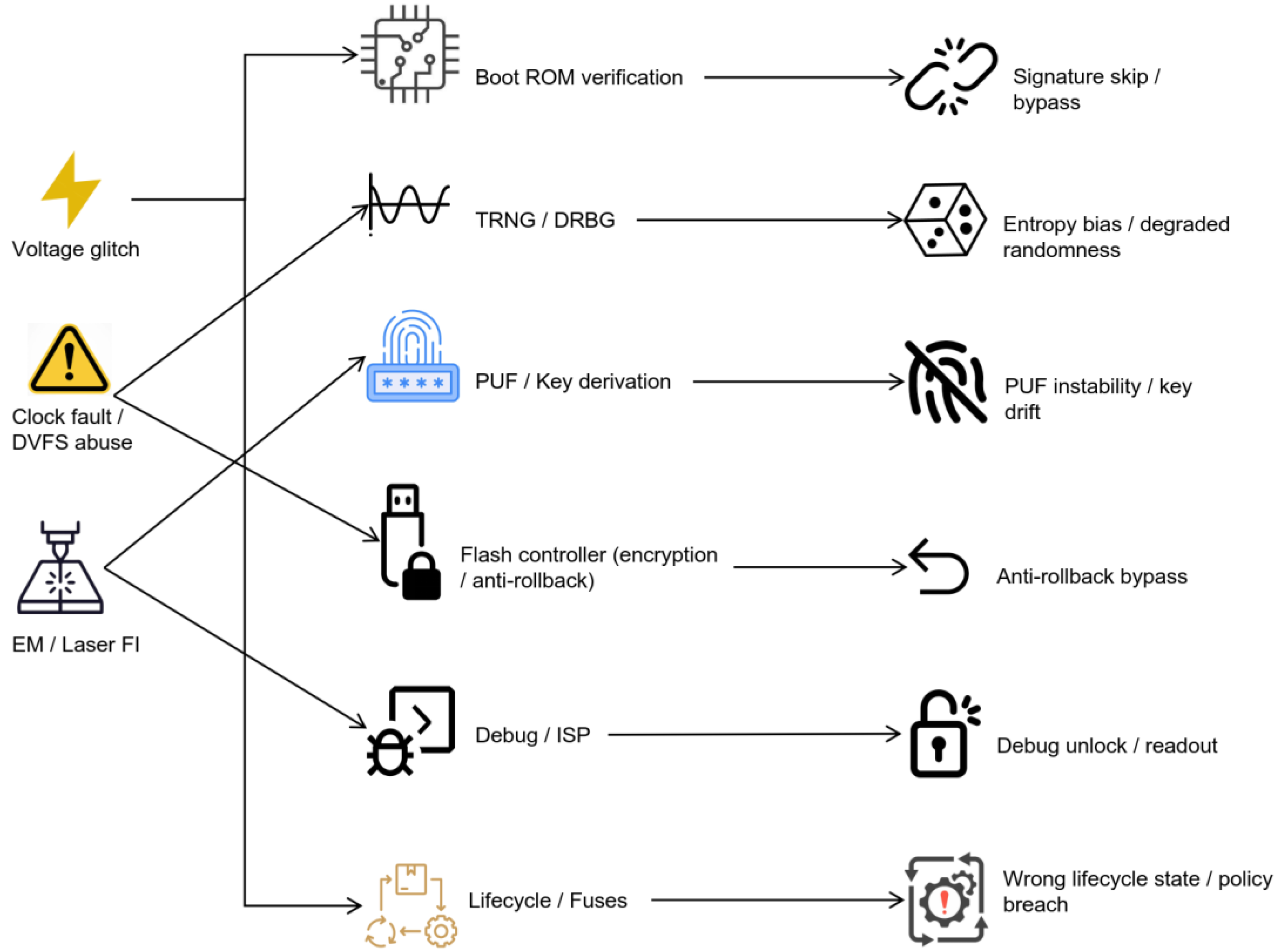 Observable: control-flow upset, MAC/tag mismatch, entropy bias, PUF BER drift, timing/power leakage.