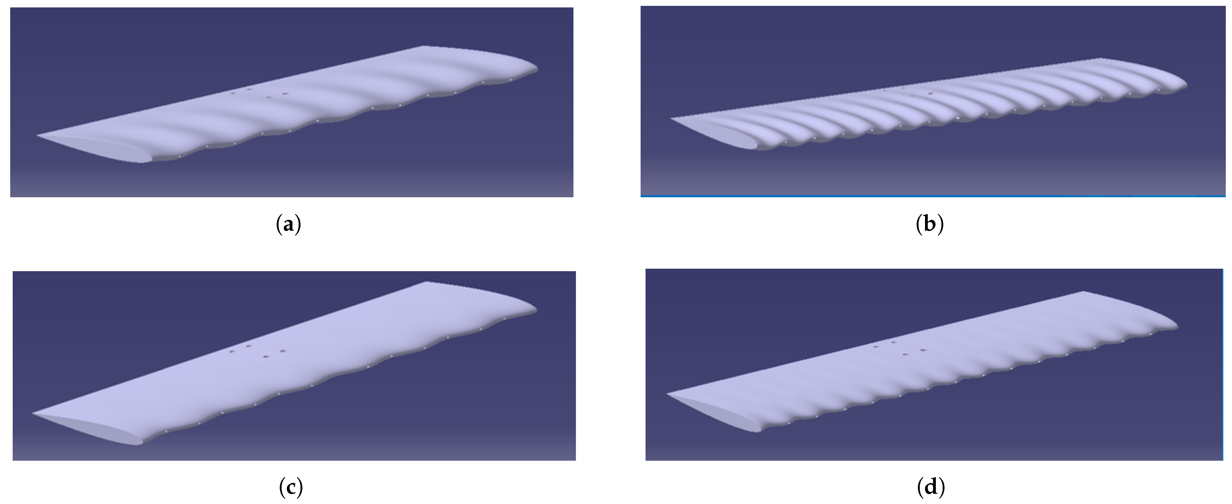 17]. The purpose was to analyze the aerodynamic performance of sinusoidal leading-edge tubercles under extremely low Reynolds number conditions. The models differ in the orientation and wavelength of the tubercles applied to the leading edge, simulating bioinspired geometries.