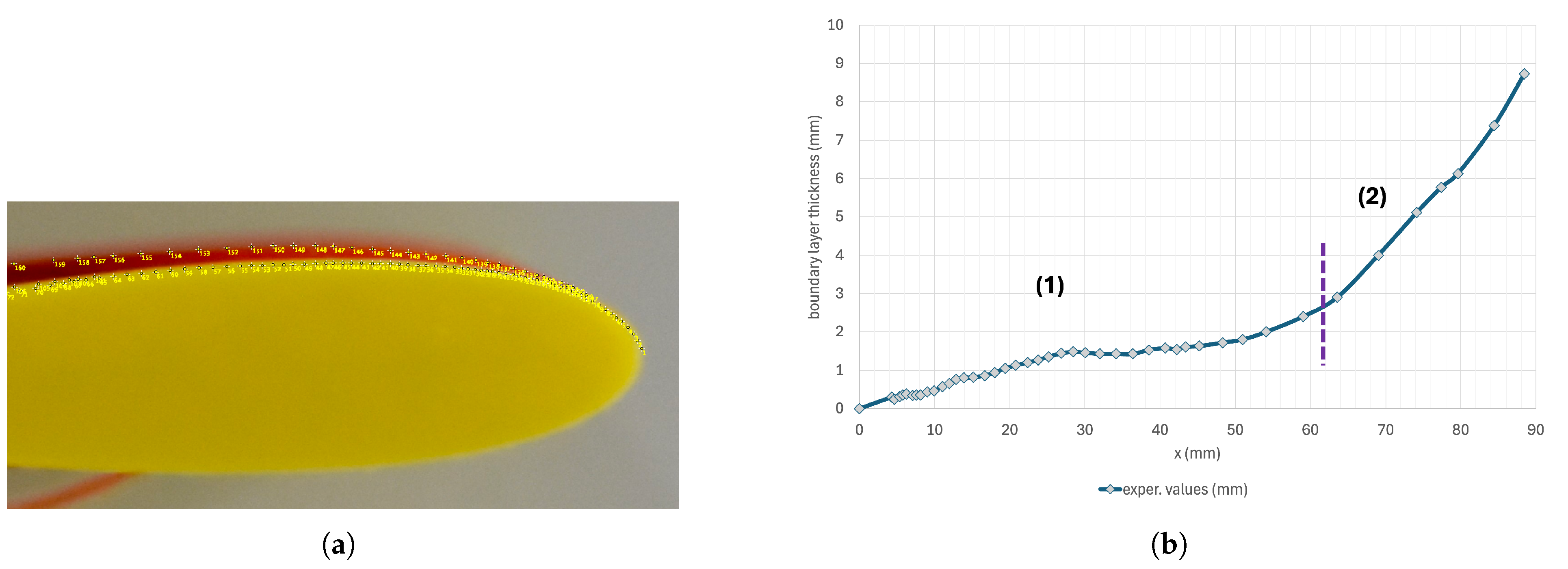 Figure 3, the first part of the thickness evolution (1) grows as a Blasius slope