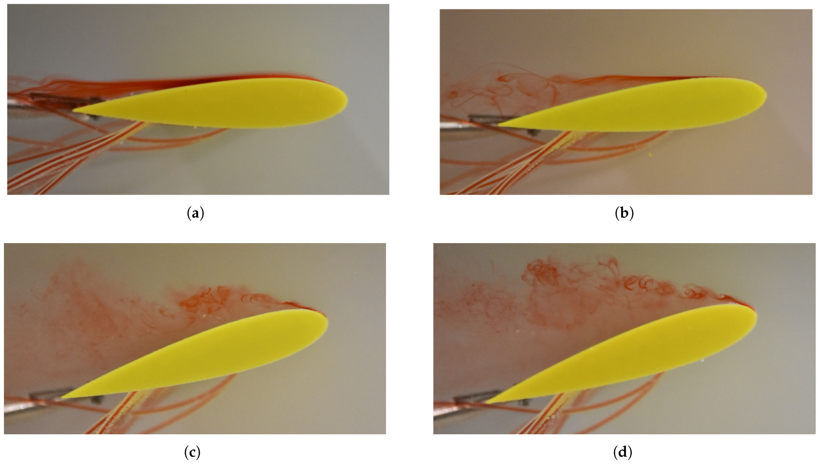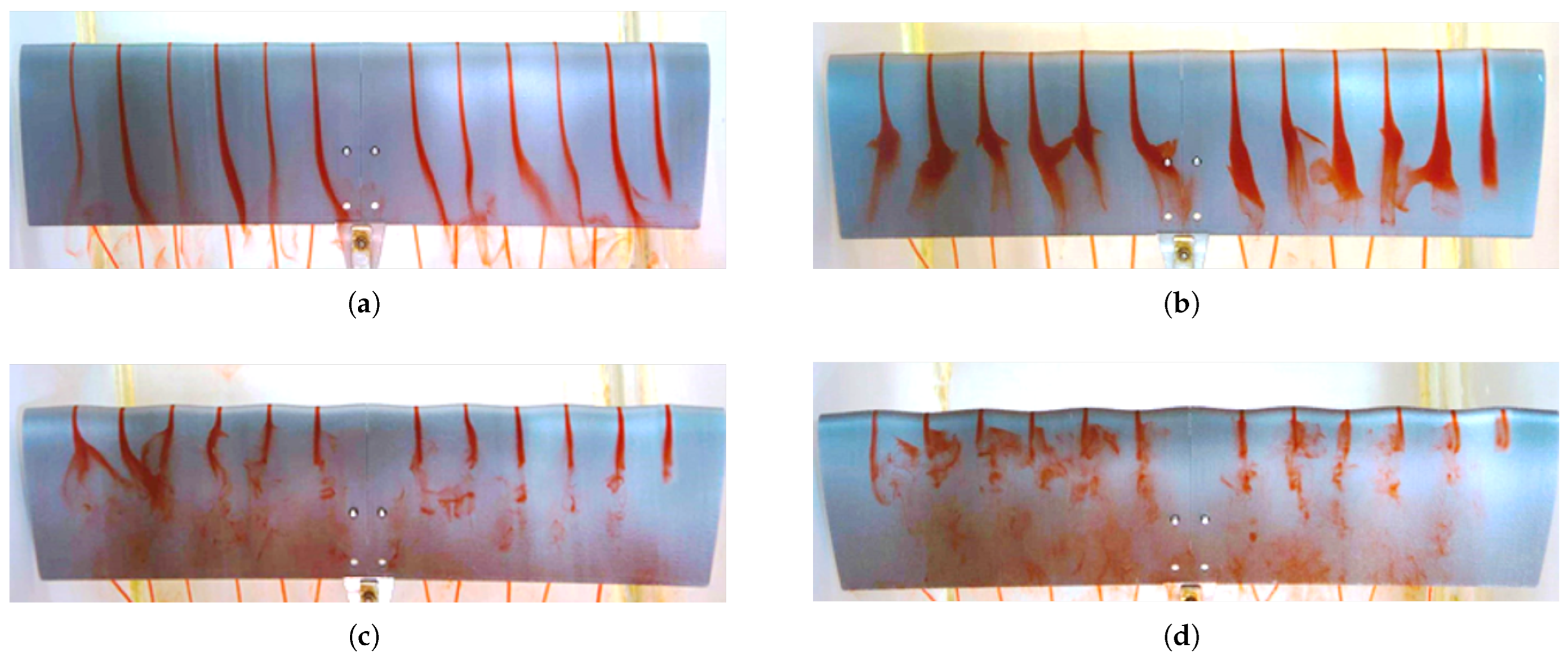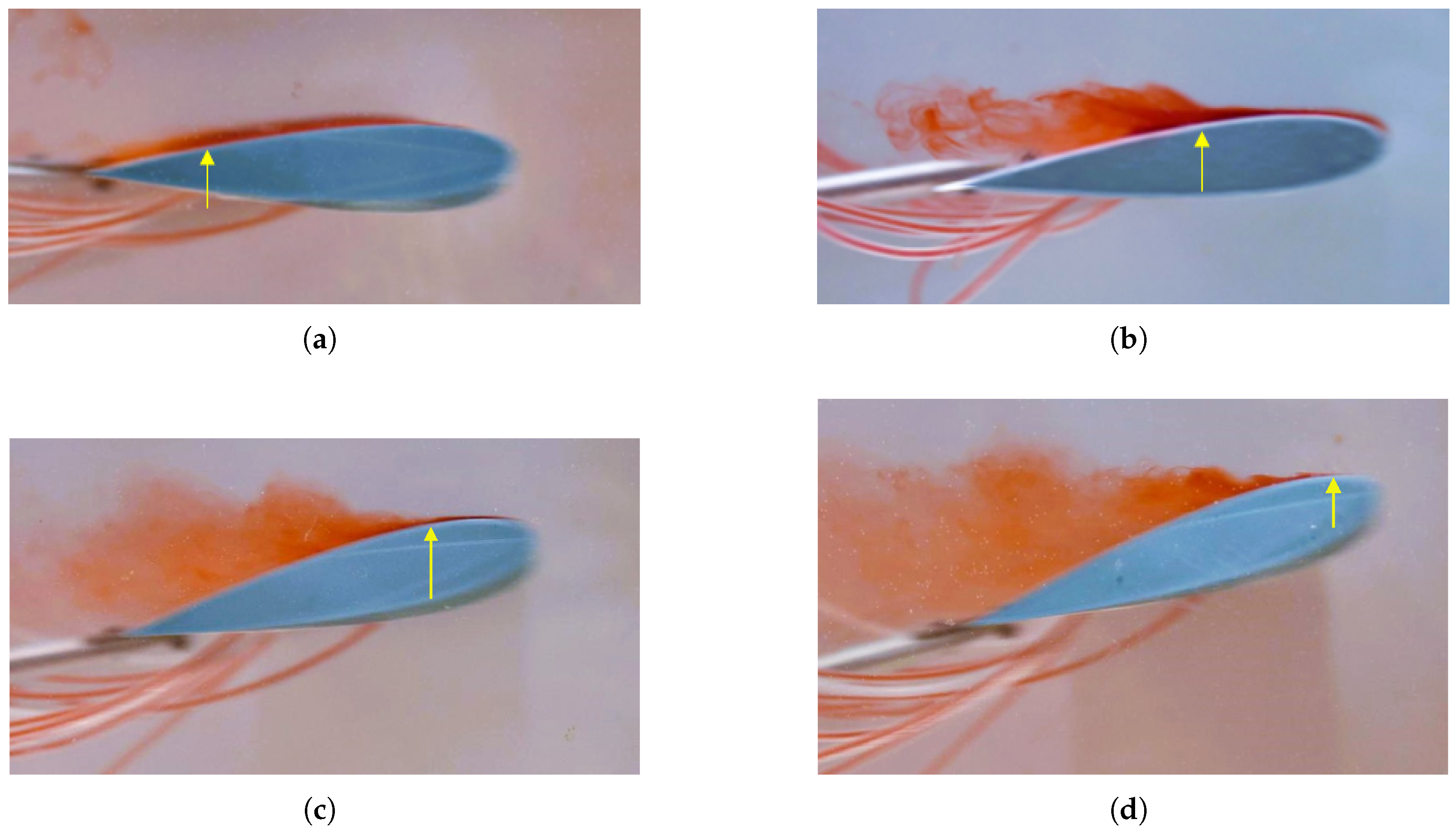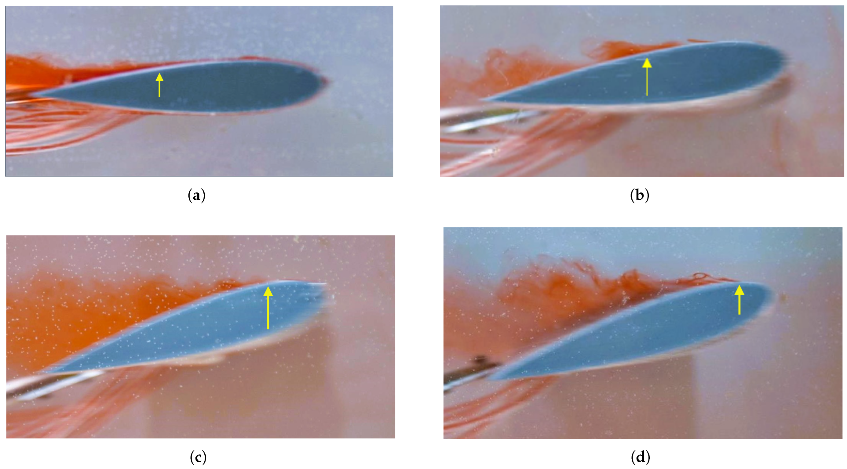 The flow was incompressible and initially laminar, though it exhibited signs of transition to turbulence at higher angles of attack. A smooth and uniform flow was achieved in the hydrodynamic towing tank by purging the ink injection system prior to each test. The angle of attack was varied from to in steps of , each setting carefully adjusted using a manual level to ensure repeatability and precision. Under these controlled conditions, the extremely low Reynolds number regime allowed for the detailed observation of boundary layer development, flow separation, and the aerodynamic influence of sinusoidal leading-edge geometries.