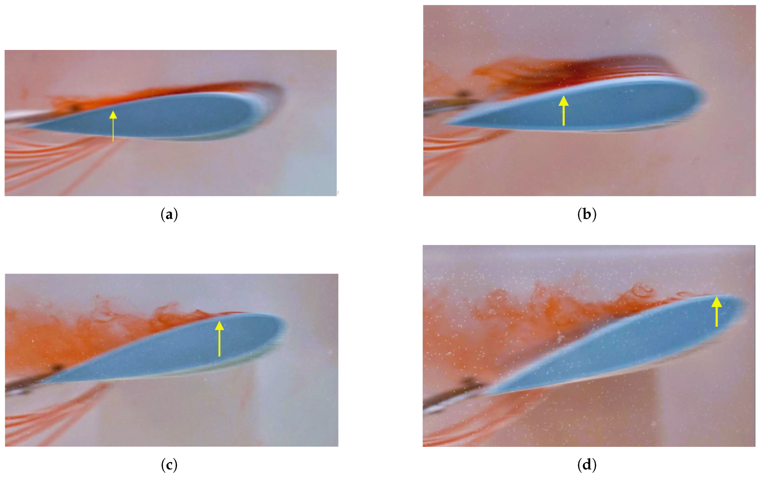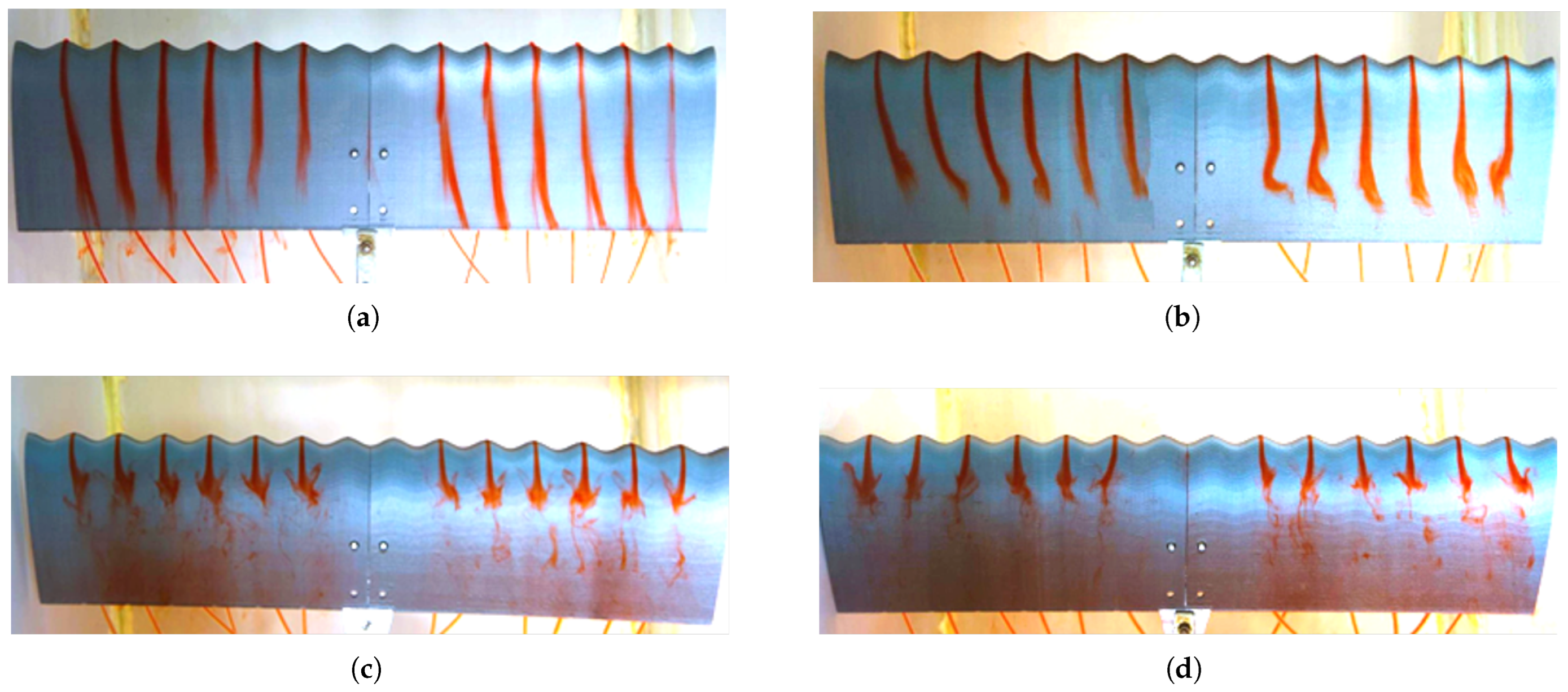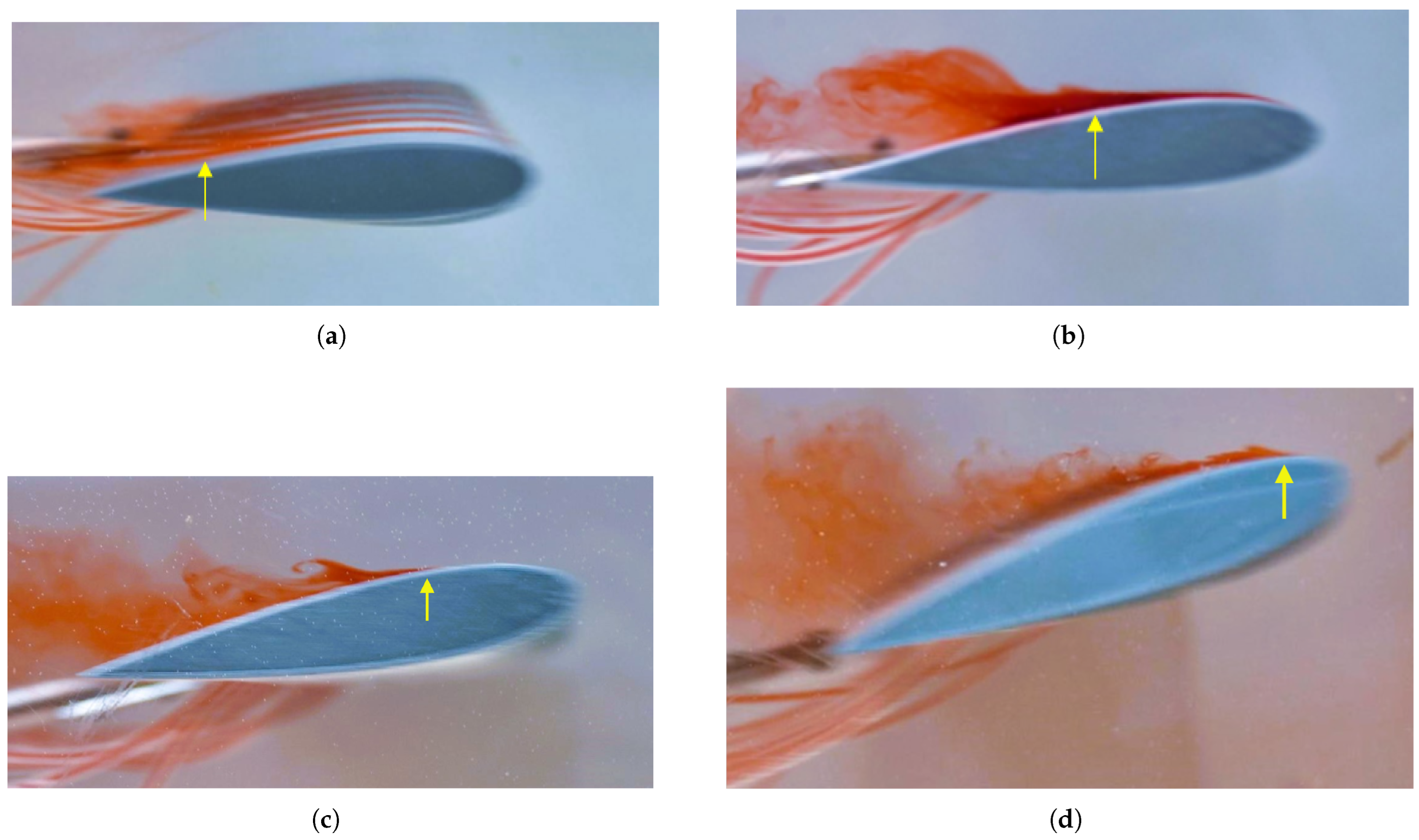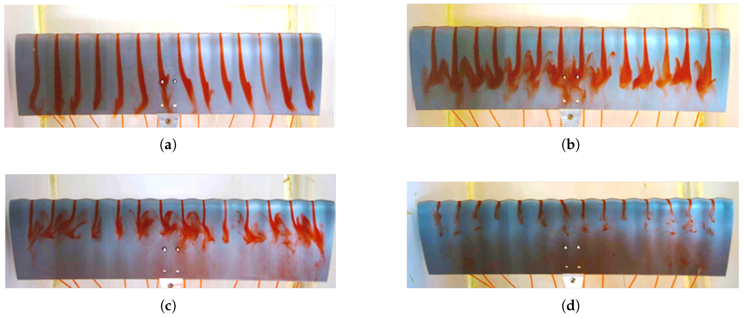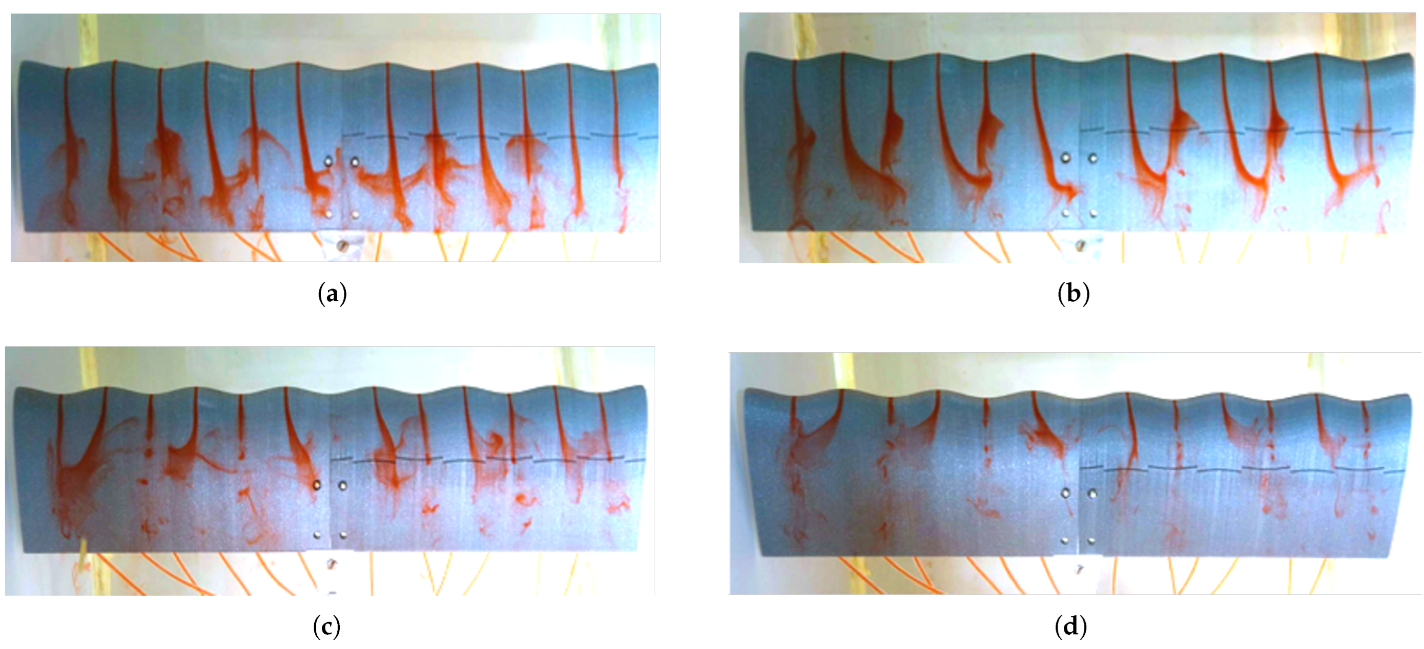 The flow was incompressible and initially laminar, though it exhibited signs of transition to turbulence at higher angles of attack. A smooth and uniform flow was achieved in the hydrodynamic towing tank by purging the ink injection system prior to each test. The angle of attack was varied from to in steps of , each setting carefully adjusted using a manual level to ensure repeatability and precision. Under these controlled conditions, the extremely low Reynolds number regime allowed for the detailed observation of boundary layer development, flow separation, and the aerodynamic influence of sinusoidal leading-edge geometries.
