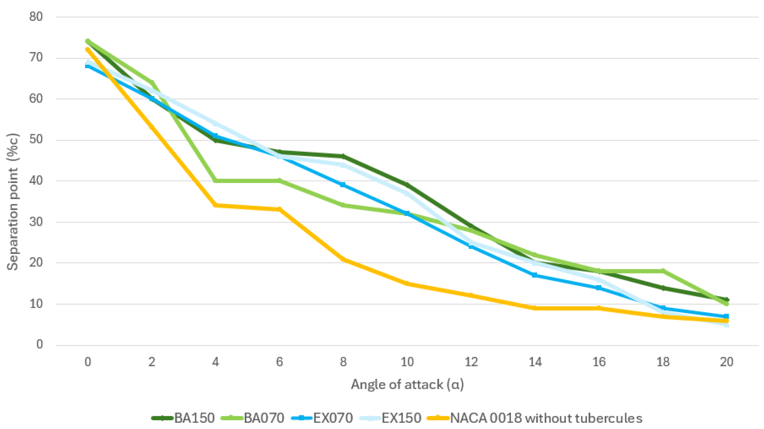 is the x position of the separation point of every NACA 0018 tubercles model (EX150, EX070, BA070, BA150);