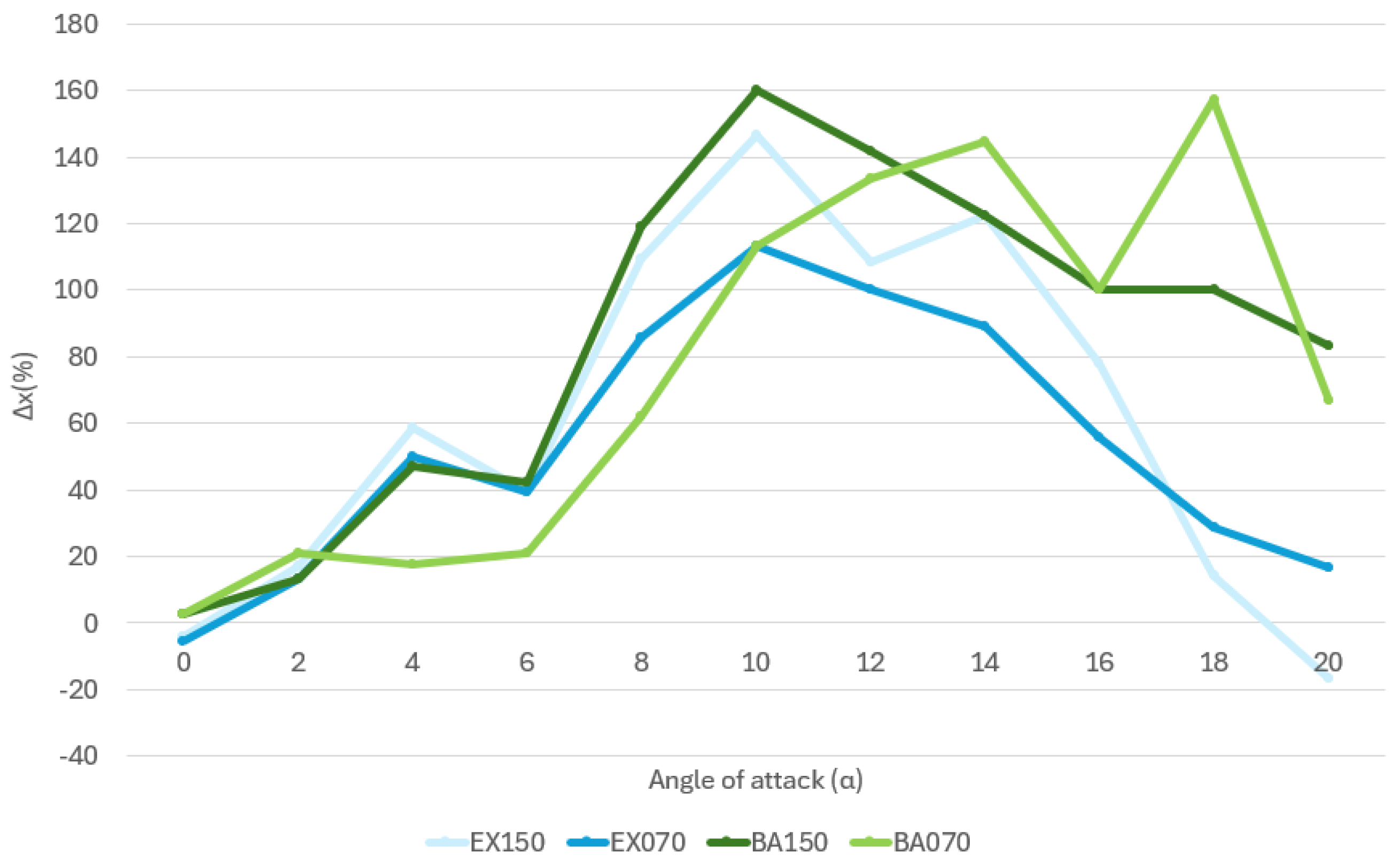 Figure 14 illustrates the deviation in separation point location with respect to the unmodified NACA 0018 profile. The positive offset observed across all configurations—particularly between