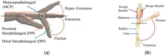 Schematic representation of finger and elbow movements: (a) flexion–extension of the fingers with main joints; (b) flexion–extension of the elbow showing the muscles and bones involved.