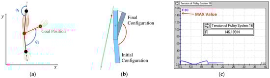Two-dimensional scheme of the prototype for the implementation of the elbow: (a) kinematic diagram; (b) initial and final configuration of the mechanism; (c) trend of cable tension over time.