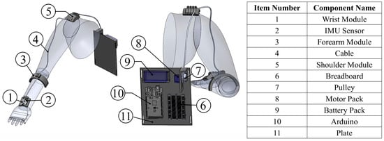 Figure 4 illustrates the complete system architecture. The modular design comprises five distinct limb-mounted modules strategically placed along the upper limb, while all motors, control electronics, and power systems are housed in a dedicated backpack unit constructed with a flexible TPU base plate. The limb-mounted components, fabricated using 3D printing with PLA material, serve exclusively as cable routing guides and attachment points, connected via a pulley transmission system mounted on a breadboard.