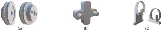 Three-dimensional models of the power transmission system: (a) front and rear views of the pulleys; (b) manual tensioning tool; (c) pulley anti-unwind mechanisms.