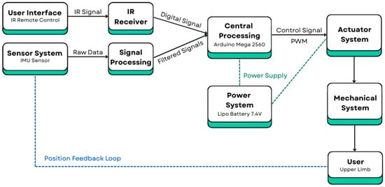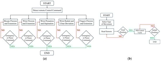 The human–machine interface consists of a Keyes infrared remote control communicating with an infrared receiver (VS1838B), allowing users to select specific movement patterns, activate standby mode, trigger emergency shutdown, and pause operations. Mechanical actuation is achieved through distributed servo motor configuration: one continuous rotation servo (INJS035-360, 35 kgfcm) for forearm movement, four continuous rotation servos (DS04-NFC) for wrist articulation, and two continuous rotation servos (AS3103PG) for finger movements. Power distribution is managed through a 7.4 V LiPo battery system. Figure 9 illustrates complete control of architecture.