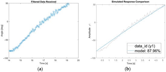 System identification was implemented to develop accurate mathematical models for PID controller tuning. Real-time angle measurements were collected with IMU positioned between elbow and hand during constant motor input (30 rpm). Data acquisition utilized serial communication (115200 baud) to transfer measurements to MATLAB (R2025a, MathWorks, Natick, MA, USA) for ARMAX model identification. The resulting discrete transfer function model is