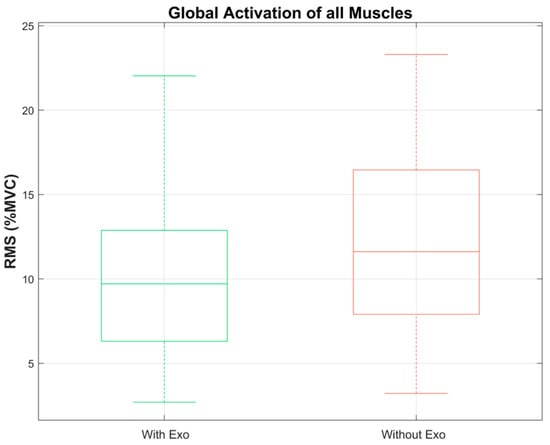 Global comparison of muscle activation across all exercises. Box plots show RMS distributions for Exo Off vs. Exo On conditions. Boxes represent the 25th–75th percentiles, whiskers extend to 1.5 × IQR, circles denote individual participant means, and diamonds indicate group means (n = 128 per condition; 8 participants × 4 muscles × 4 exercises).