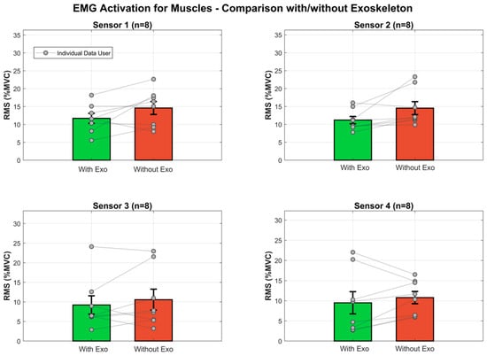 Muscle activation comparison between Exo Off and Exo On conditions. Bar plots show mean RMS values (±SE) normalized to MVC for the four monitored muscles. Points represent participant means connected by lines to illustrate within-subject changes.