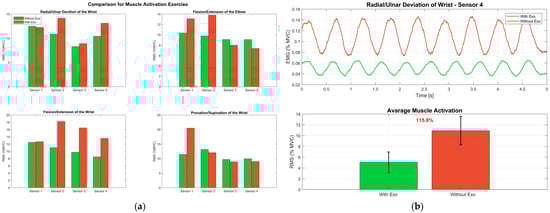 Muscle activity during exercises: (a) Mean RMS values of the four muscles across the four exercises, with bars grouped by condition (Exo Off vs. Exo On); (b) EMG temporal analysis during a representative radial/ulnar deviation test, showing five consecutive repetitions (Rep 1–Rep 5) of the filtered signals of the four monitored muscles.