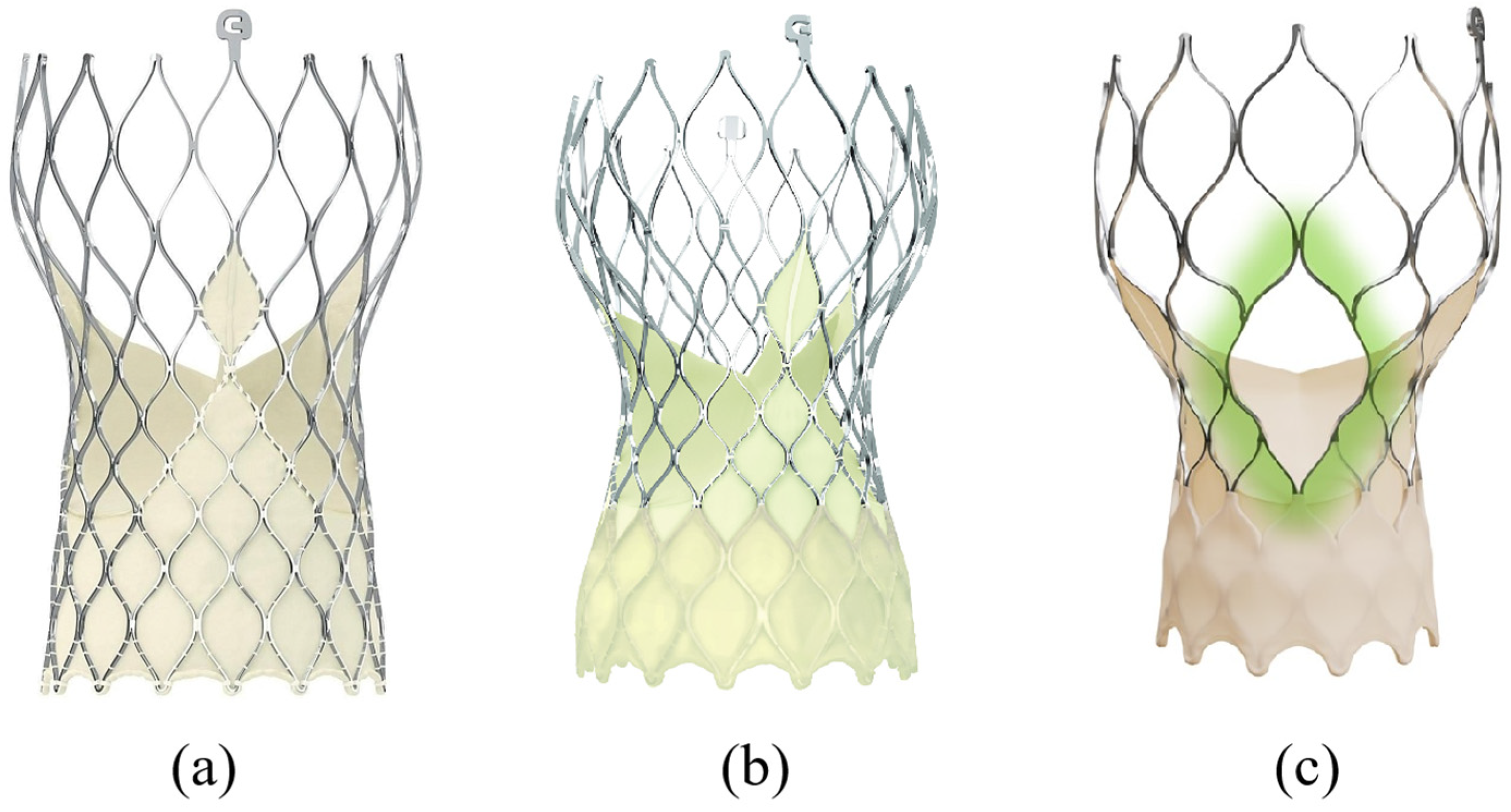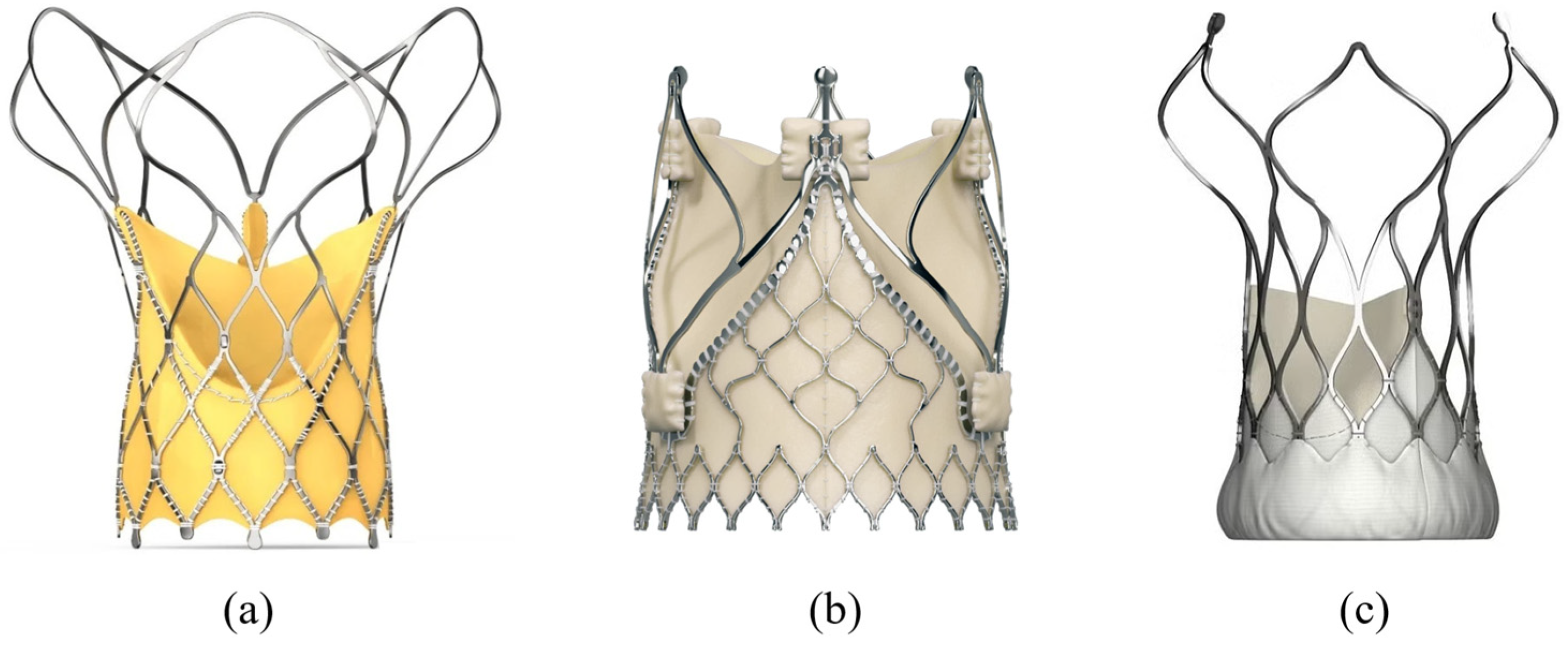 Figure 5. Transcatheter heart valve prostheses from Asian manufacturers: (a) Hydra; (b) J-Valve; (c) VitaFlow.