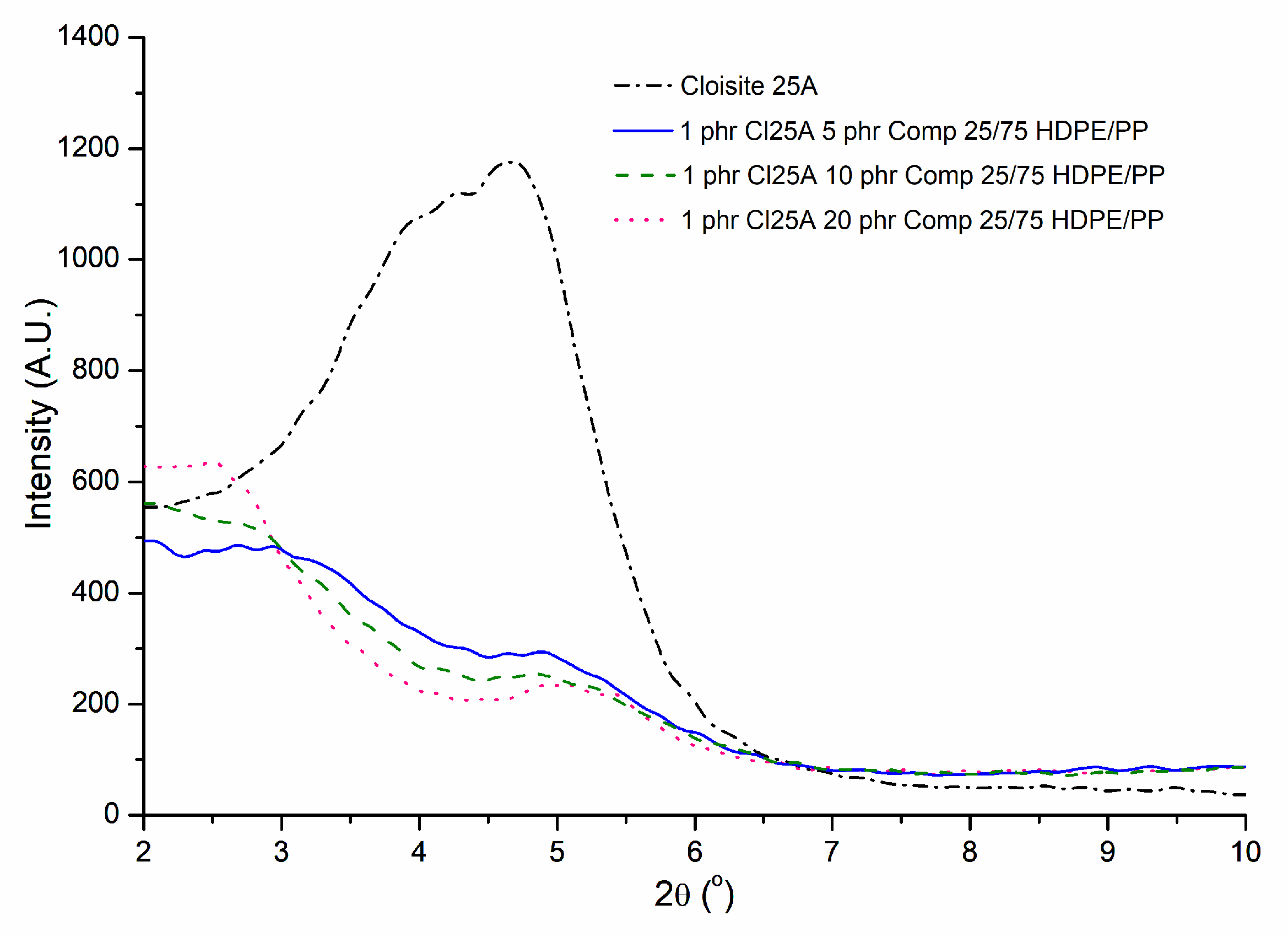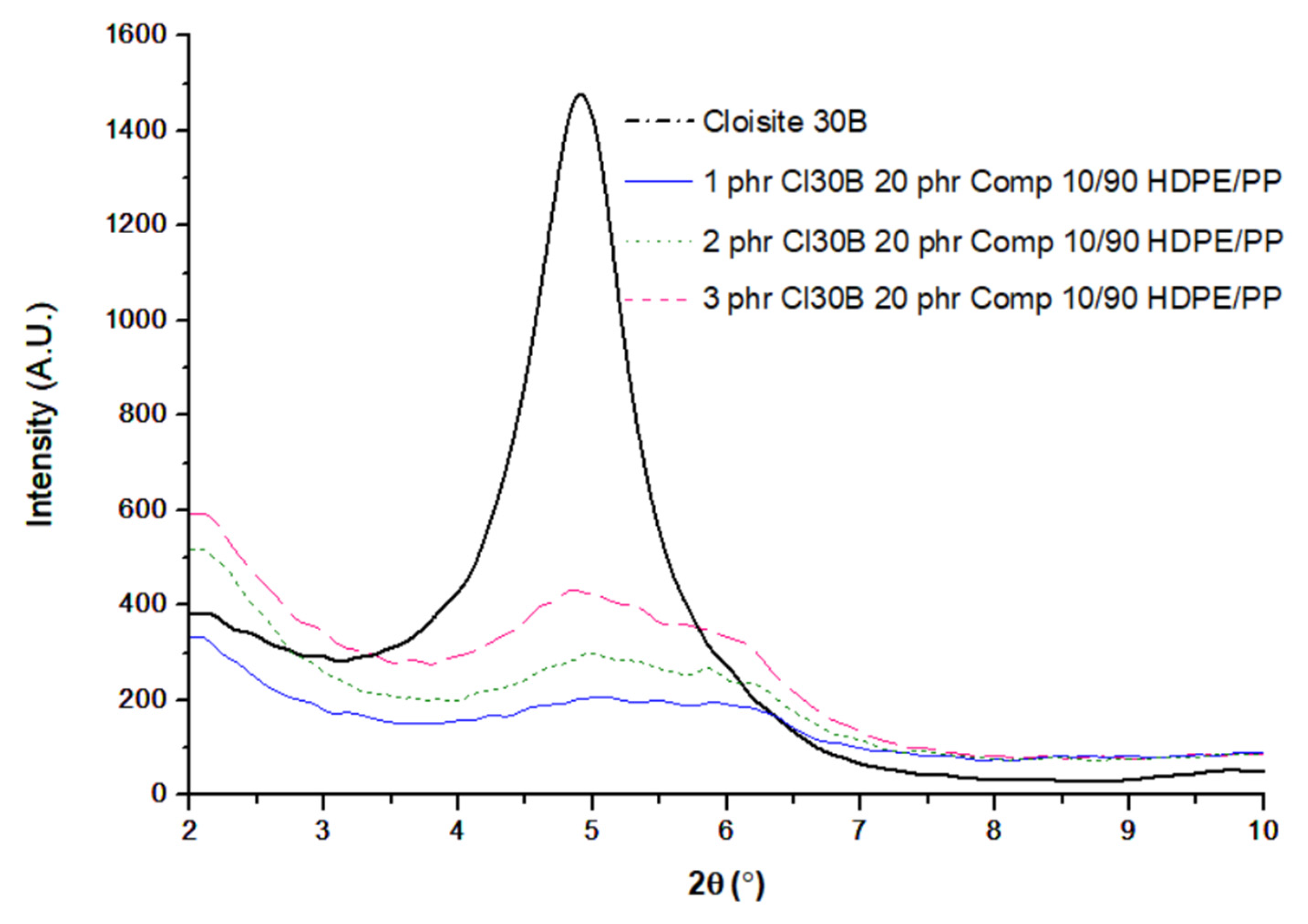 - Santos, K.S.; Liberman, S.A.; Oviedo, M.A.S.; Mauler, R.S. Polyolefin-based nanocomposite: The effect of organoclay modifier. J. Polym. Sci. Part B Polym. Phys. 2008, 46, 2519–2531. [Google Scholar] [CrossRef]