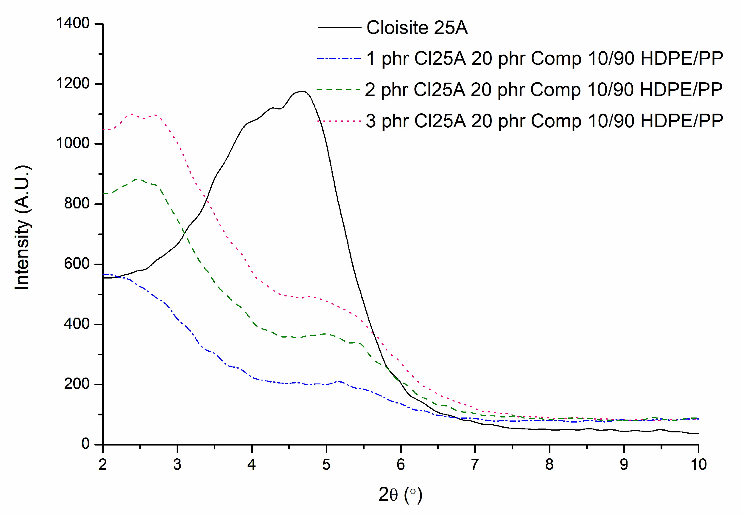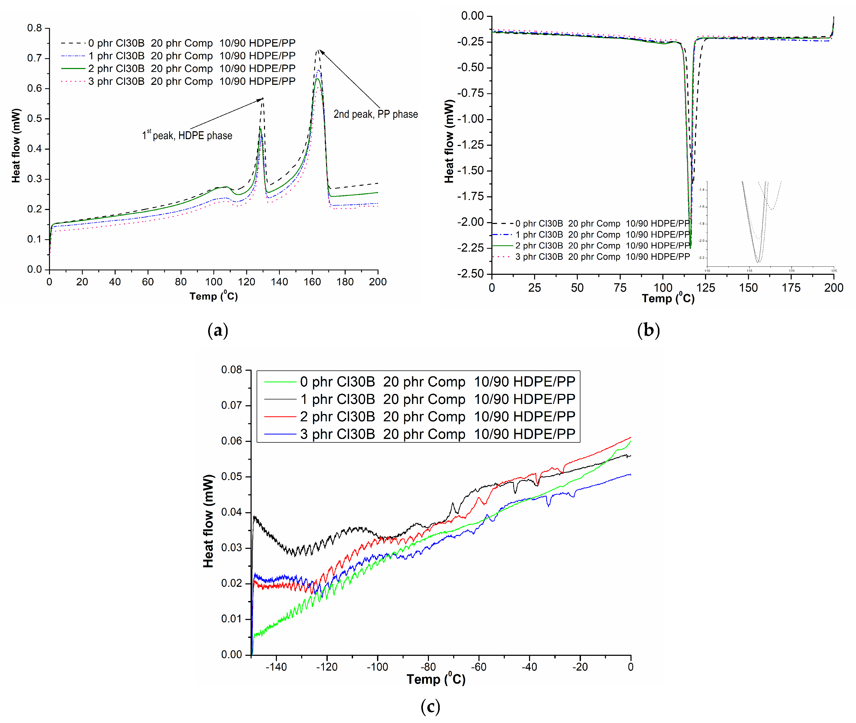 - Boufassa, S.; Doufnoune, R.; Hellati, A.; Haddaoui, N.; Cagiao, M.E. Effect of compatibilizing agents on the physical properties of iPP/HDPE organoclay blends. J. Polym. Eng. 2013, 33, 589–598. [Google Scholar] [CrossRef]