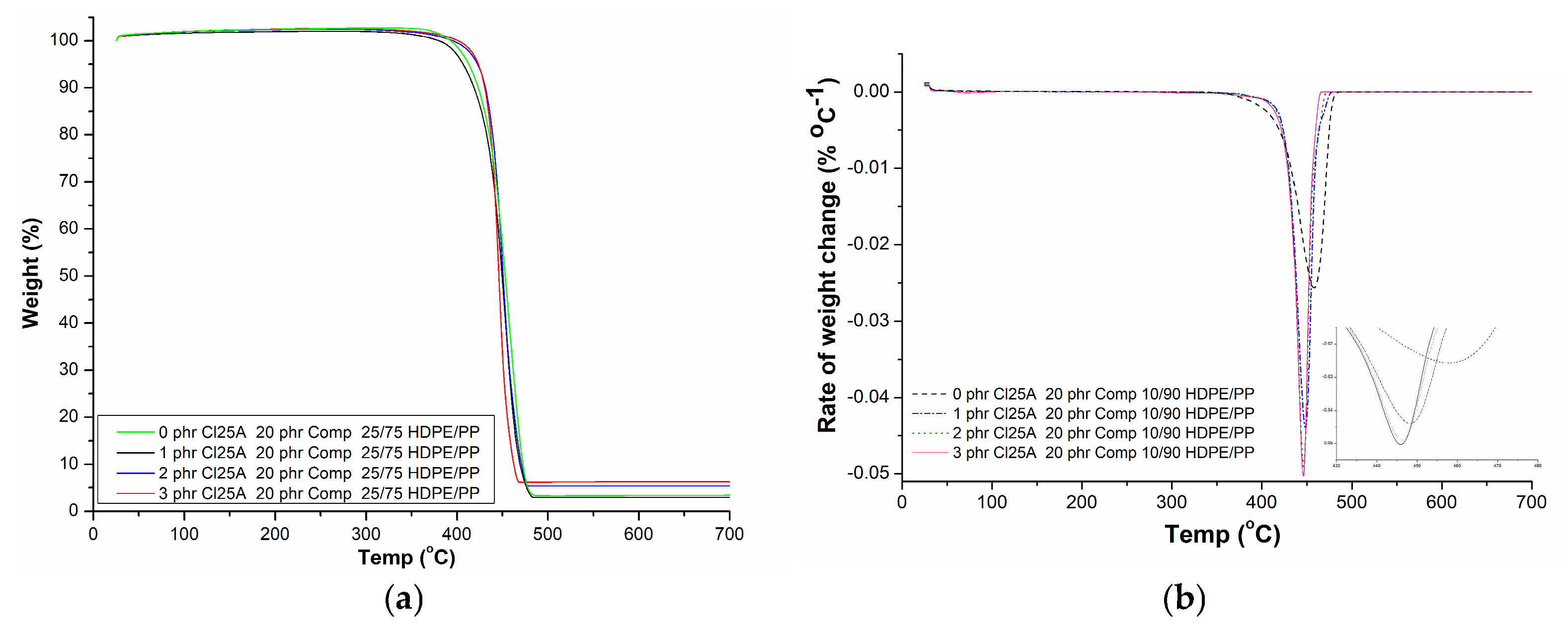 - Modesti, M.; Lorenzetti, A.; Bon, D.; Besco, S. Thermal behaviour of compatibilised polypropylene nanocomposite: Effect of processing conditions. Polym. Degrad. Stab. 2006, 91, 672–680. [Google Scholar] [CrossRef]