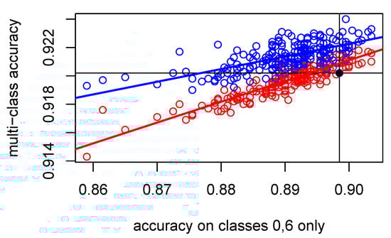 We can conclude that even when Q has inferior pairwise accuracy to , the coupling methods are able to increase the multi-class accuracy. The Bayes covariant method (red regression line in Figure 6) is slightly better than the Wu–Lin–Weng method (blue regression line) over the range of pairwise accuracies afforded by mini-networks of type A. However, the latter is more efficient in converting an increase in the pairwise accuracy to an increase in the multiclass accuracy. In fact, the linear regression model for the Wu–Lin–Weng method has an , whereas it has an for the Bayes covariant method.