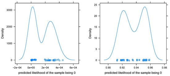 Predicted likelihoods of image #142 for 100 randomly recombined pairwise classifiers from networks and . Left image: Using the Wu–Lin–Weng method; right image: using the Bayes covariant method.