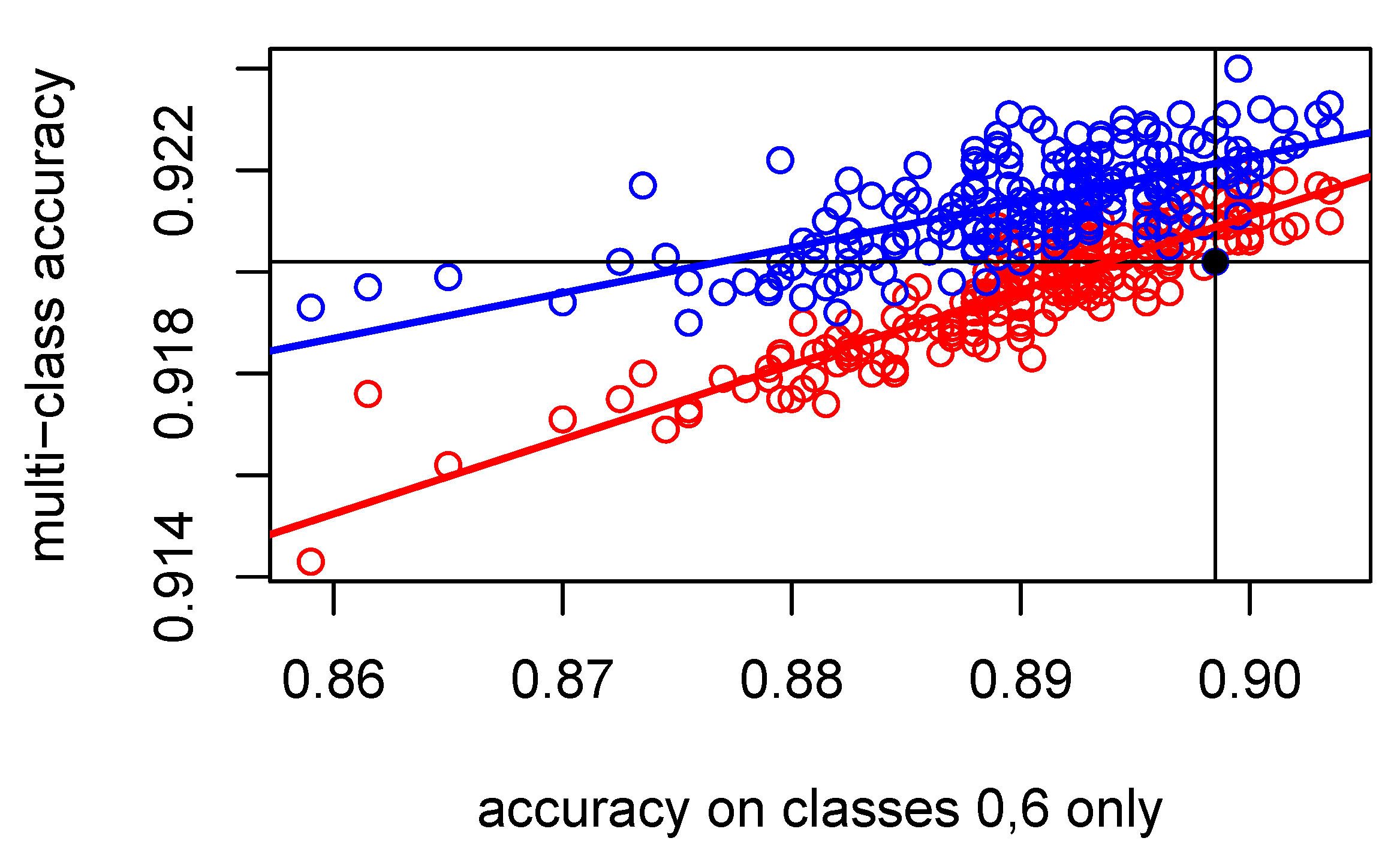 However, the subpar pairwise accuracy of micro-networks and subpar multi-class accuracy of micro-models should be contrasted with the success of mini-networks and mini-models. All mini-networks achieved higher pairwise accuracy than the baseline, and mini-models A and B (although not C and D) with the Bayes covariant method (but not the Wu–Lin–Weng method) obtained statistically significant improvements in performance over the baseline. Recall that the mini-models were designed to have approximately the same arithmetical complexity in training as the baseline. We would like to point out that there are likely additional performance advantages to using mini-models: