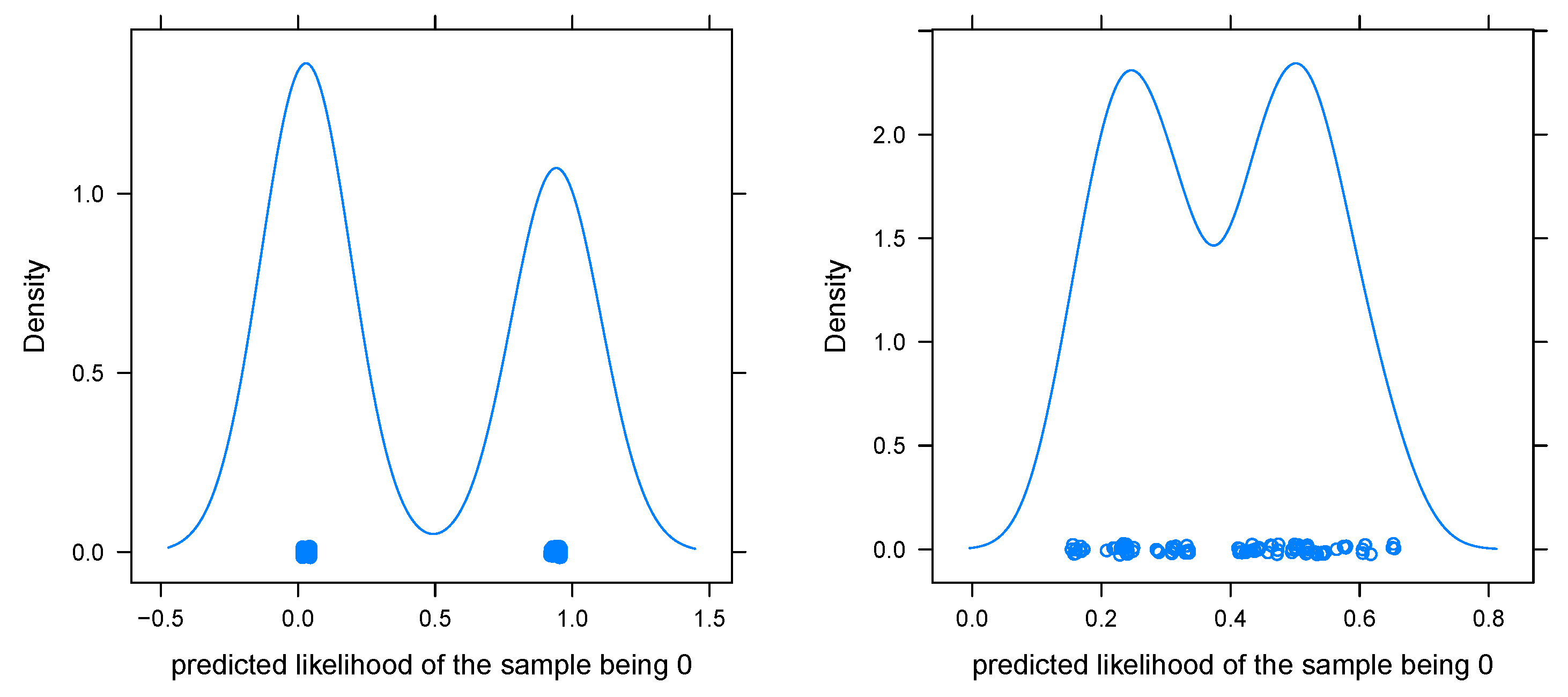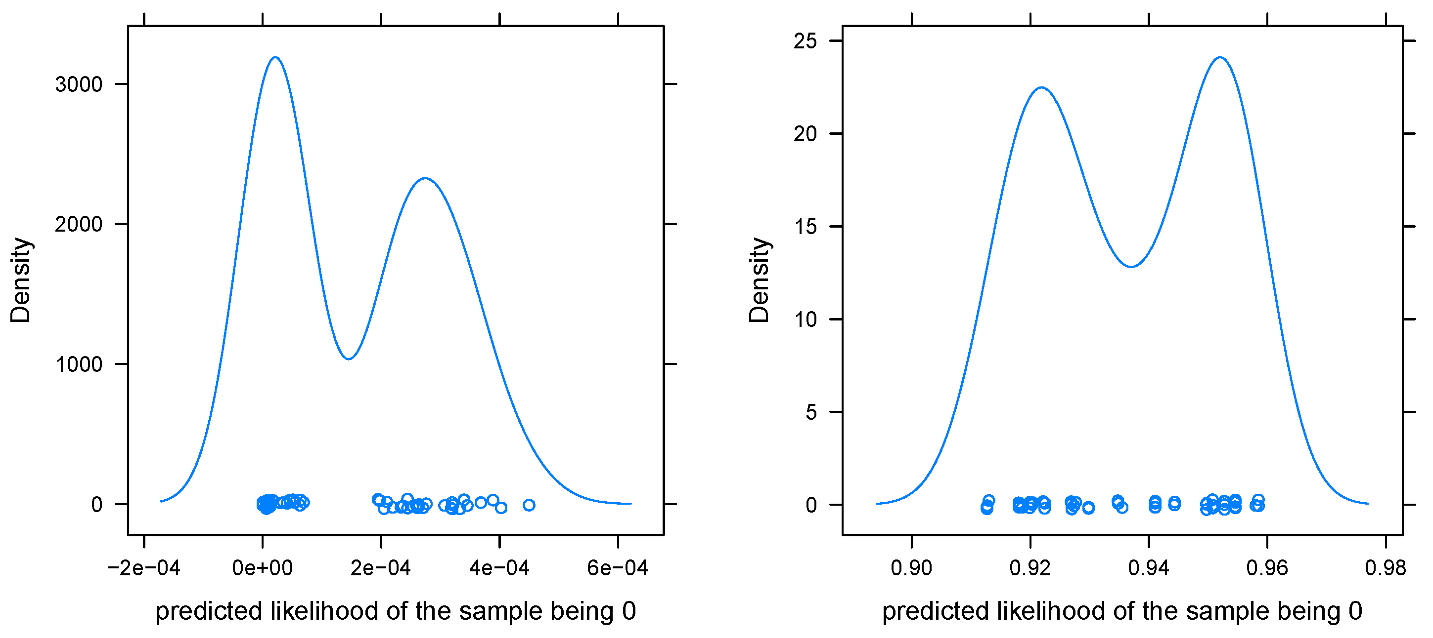 The plots show that there is a significant difference between the Wu–Lin–Weng method and the Bayes covariant method. The former is strongly clustered in two clusters near 0 and 1, whereas the latter is much more uniformly distributed from 0.1 to 0.9. The natural assumption that the binary classifier for the pair 0/6 has a crucial influence on the multi-class posteriors is confirmed by plotting conditional density plots in