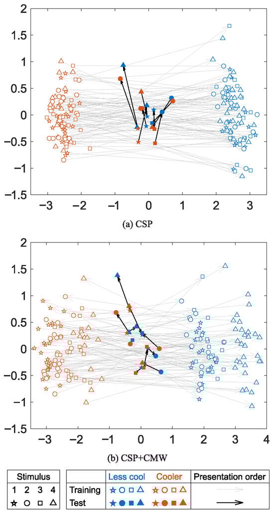 Examples of two-dimensional embeddings of feature vectors () extracted using (a) CSP and (b) CSP with covariance matrix weighting in the coolness assessment by Participant 3. Each marker represents an embedding derived from MEG signals recorded during a stimulus presentation.
