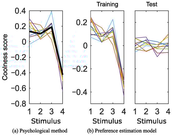 Average estimated coolness scores of the four stimuli for Participant 3. Each colored line represents the average estimated scores in each fold of the cross-validation. (a) Average scores estimated using the psychological method. The black line represents the scores estimated from all comparative judgments. (b) Average scores estimated by the preference estimation models from the MEG signals in the training and test set.