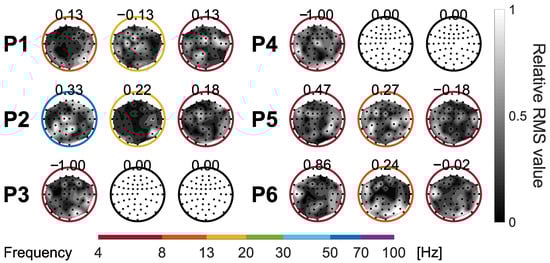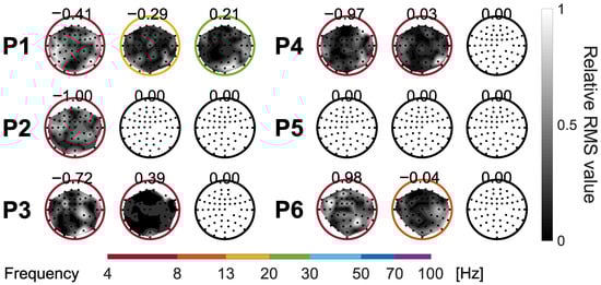 Topographic maps of the three spatial patterns most strongly associated with the HVAC sound coolness for all participants. Numerical values above the circles indicate the standardized linear weights of features corresponding to the spatial patterns, reflecting their contributions to coolness score estimation. Circle colors indicate the frequency bands. In each map, the upper and lower sides correspond to the front and back of the head, respectively. Dots represent MEG sensor locations. The grayscale indicates the relative root mean square (RMS) value of each spatial pattern across the topographic map.