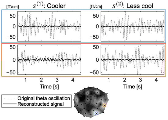 The MEG signals associated with the coolness of HVAC sounds were reconstructed in the original channel space from the spatially filtered MEG signals. Specifically, let denote a signal extracted by a spatial filter and denote the corresponding spatial pattern. The signal reconstructed from in the original channel space is given by . An example of the reconstructed signals for Participant 3 is shown in Figure 5. Theta oscillations that were respectively enhanced and suppressed when listening to cooler and less cool sounds were observed. Nevertheless, the reconstructed signals were considerably smaller than the original MEG signals in the theta band.