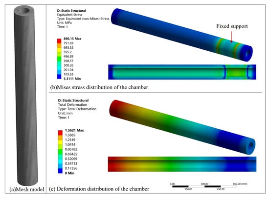 Boundary conditions were prescribed as follows: a uniform wall temperature of 150 °C (thermal step, reference 22 °C) and an internal pressure of 140 MPa applied on the inner cylindrical surface (structural step), with the outer surface held at zero gauge pressure. The lower sidewall region was constrained using a fixed support condition (Ux = Uy = Uz = 0) to simulate the mechanical assembly constraints. End regions were treated as adiabatic in the thermal step. This fixed support corresponds to the clamping interface in practical assembly and provides a conservative estimate of local stress concentration near the support. The simulation results are shown in Figure 4. The maximum von Mises stress reached 890.15 MPa, occurring at the fixed support location, while the maximum deformation was 1.5621 mm at the opposite end of the chamber.