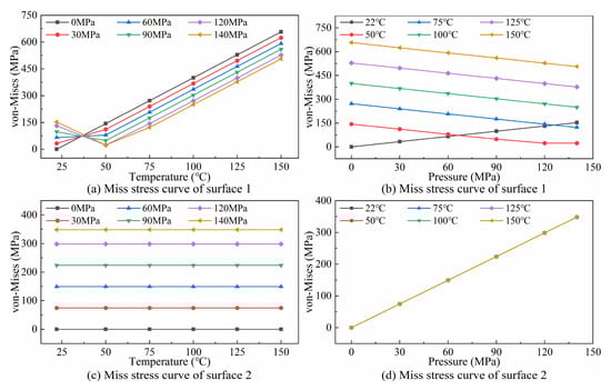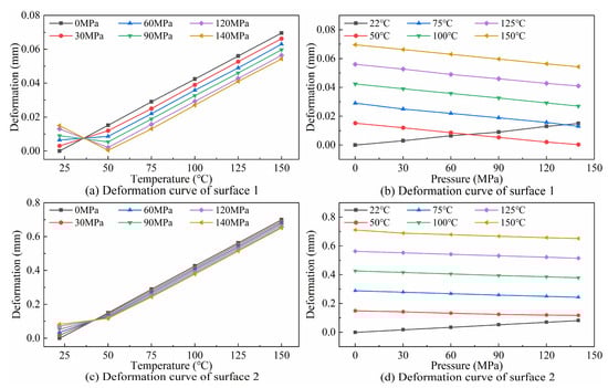 Since no fixed support is applied at surface 2, thermally induced stress and deformation are allowed to develop and relax. As shown in Figure 6c,d, the Mises stress at surface 2 is strongly correlated with internal pressure and remains nearly unaffected by temperature. However, as seen in Figure 7c,d, temperature has a significant influence on deformation. At constant pressure, deformation increases with temperature. At constant high temperature, thermally induced deformation partially offsets pressure-induced deformation, and in the absence of support constraints, a weak negative correlation with pressure is observed. In magnitude, deformation of surface 1 remains small (below about 0.07 mm across all cases) and, at high temperature, increasing pressure from 0 to 140 MPa reduces it by only about 0.015 mm; deformation of surface 2 is much larger, about 0.65 to 0.70 mm at 150 °C. The simulation results indicate that constrained regions are more sensitive to temperature-induced stress fluctuations, whereas in unconstrained regions, stress is governed primarily by pressure.
