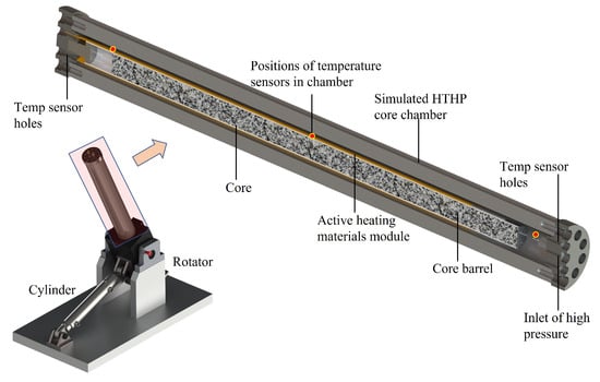 Research on thermal insulation coring technologies has been largely limited to applications in combustible ice sampling. For example, Germany’s OMEGA project developed the Multiple Autoclave Corer (MAC) and the Dynamic Autoclave Piston Corer (DAPC). After sampling, cores are stored at low temperatures on the surface using external refrigeration devices []. The Japan National Petroleum Corporation commissioned Aumann & Associates Inc. (AAI) to develop the Pressure Temperature Core Sampler (PTCS), which maintains temperature using insulated inner tubes and thermoelectric cooling technology []. The China Institute of Marine Geology developed the Pressure and Temperature Preservation System (PTPS), which uses a ZrO2-8%Y2O3 coating on the outer tube to reduce heat exchange with the environment. A vacuum insulation layer is formed between the outer tube and the pressure cylinder, and both are coated with thermal insulation materials []. However, these corers are limited to low-temperature preservation and mainly adopt passive thermal insulation approaches. Such methods are inadequate for maintaining in situ temperatures, especially in deep reservoirs characterized by HTHP conditions. Therefore, the development of active ITP-coring technology is essential for deep reservoirs, enabling stable and long-term maintenance of in situ high temperatures [,].