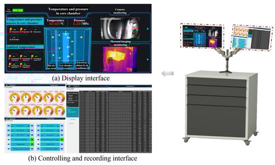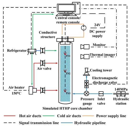 Temperature control for both the chamber and its surrounding environment is achieved through the coordinated operation of a hot air blower and a refrigeration unit (see Section 3.4). Several high-pressure-resistant temperature sensors are strategically placed within the chamber to enable real-time monitoring of temperature distribution. Pressure conditions are generated using an external hydraulic station that supplies high-pressure fluid via hydraulic pipelines. Mechanical and electronic gauges are employed for continuous monitoring and regulation of internal pressure (see Section 3.3). A schematic of the HTHP simulation and monitoring system is presented in Figure 10.