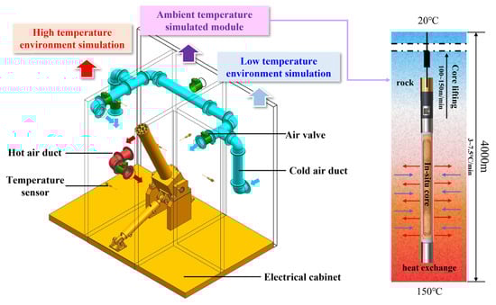 - Environmental temperature simulation: To simulate the temperature variation during core retrieval, the system replicates a continuous temperature decrease of 3–7.5 °C/min, assuming a temperature gradient of 3–5 °C/100 m and a core lifting speed of 100–150 m/min.