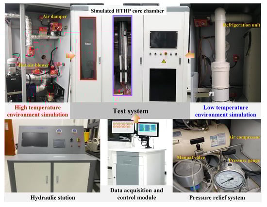 Following the development concept outlined in Figure 2, the testing system comprises four modules: the ambient temperature simulation module, high-pressure simulation module, through-chamber conductive module, and data acquisition and remote control module, each designed around a simulated HTHP core chamber. The overall system layout is illustrated in Figure 3.