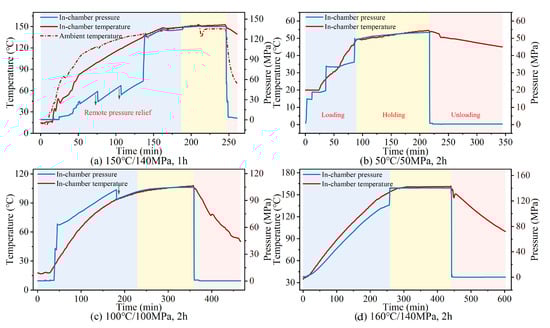 To test system adaptability, additional experiments were carried out under three representative conditions: 50 °C/50 MPa, 100 °C/100 MPa, and 160 °C/140 MPa, as shown in Figure 16b–d. In the 50 °C/50 MPa test (Figure 16b), the pressure was increased step-by-step and held at each level. After the chamber temperature reached the set point, pressure compensation was applied, and the system remained stable for two hours before depressurization. In the 100 °C/100 MPa test (Figure 16c), the initial pressurization slightly overshot. Pressure then gradually increased alongside temperature. Before the target temperature was reached, the pressure approached a critical level, triggering automatic pressure relief. In the 160 °C/140 MPa test (Figure 16d), no external pressurization was applied initially. The pressure increased naturally as the temperature rose, and pressure compensation was automatically triggered at the target temperature.