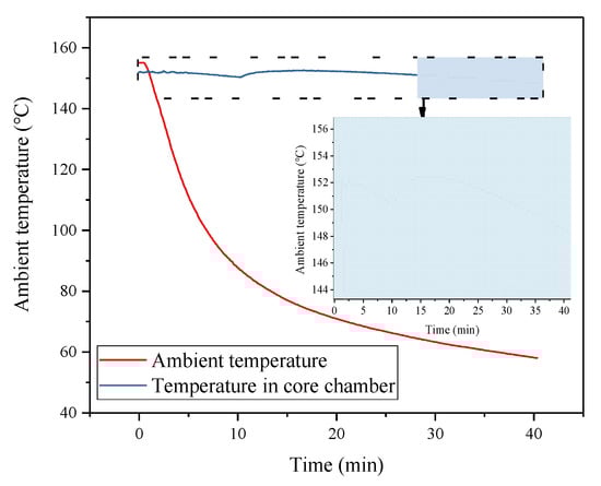 To evaluate the comprehensive performance of the active ITP-coring system under HTHP conditions, a testing setup was established, as shown in Figure 18. The system consisted of a heating materials module and a core barrel, both enclosed within the simulated HTHP core chamber. The heating module was connected to the conductive central rod and the temperature sensing and control module via the through-chamber conductive structure located on the upper end cap of the chamber, ensuring reliable electrical connection between the internal heating unit and the external control system. The heating materials module was powered by a DC regulated power supply (24 V), while the control module was powered by a high-temperature battery. The entire setup was placed inside the ambient temperature simulation chamber, which was used to reproduce the temperature drop that occurs during core lifting from deep reservoirs. During the test, the temperatures of both the chamber and the external environment were first raised to 150 °C, followed by pressurization of the chamber to 140 MPa. Subsequently, the ambient temperature simulation unit initiated a cooling process to replicate the thermal disturbance during coring, thereby verifying the thermal preservation performance of the active ITP-coring system under simulated in situ coring conditions. The experimental results are shown in Figure 19. During the initial 16 min of cooling, the simulated ambient temperature for coring exhibited a maximum cooling rate of 15.53 °C/min and an average cooling rate of 5.02 °C/min. As cooling progressed, the rate gradually declined. Throughout this process, the active ITP-coring system remained operational to maintain the initial in situ temperature within the core chamber. At the early stage of ambient cooling, the chamber temperature showed a slight decline followed by a rebound. This behavior is attributed to the sensing and control module, which detected the drop in internal temperature and activated the heating materials module to compensate, ensuring thermal stability. As the ambient temperature continued to decrease, the temperature gradient between the chamber and its surroundings increased, leading to a gradual decline in chamber temperature. The overall cooling curve, as presented in Figure 19, exhibits a convex profile, in contrast to the linear decline observed in Figure 17, highlighting the thermal inertia effect introduced by the active ITP-coring system. Ultimately, the ambient temperature dropped to 57.6 °C, and the internal chamber temperature decreased to 148.4 °C over 40.5 min, corresponding to a temperature loss of 4.2 °C (2.76%). In comparison, under identical conditions without active ITP-coring, the temperature decreased by 13.1 °C within 14.9 min.