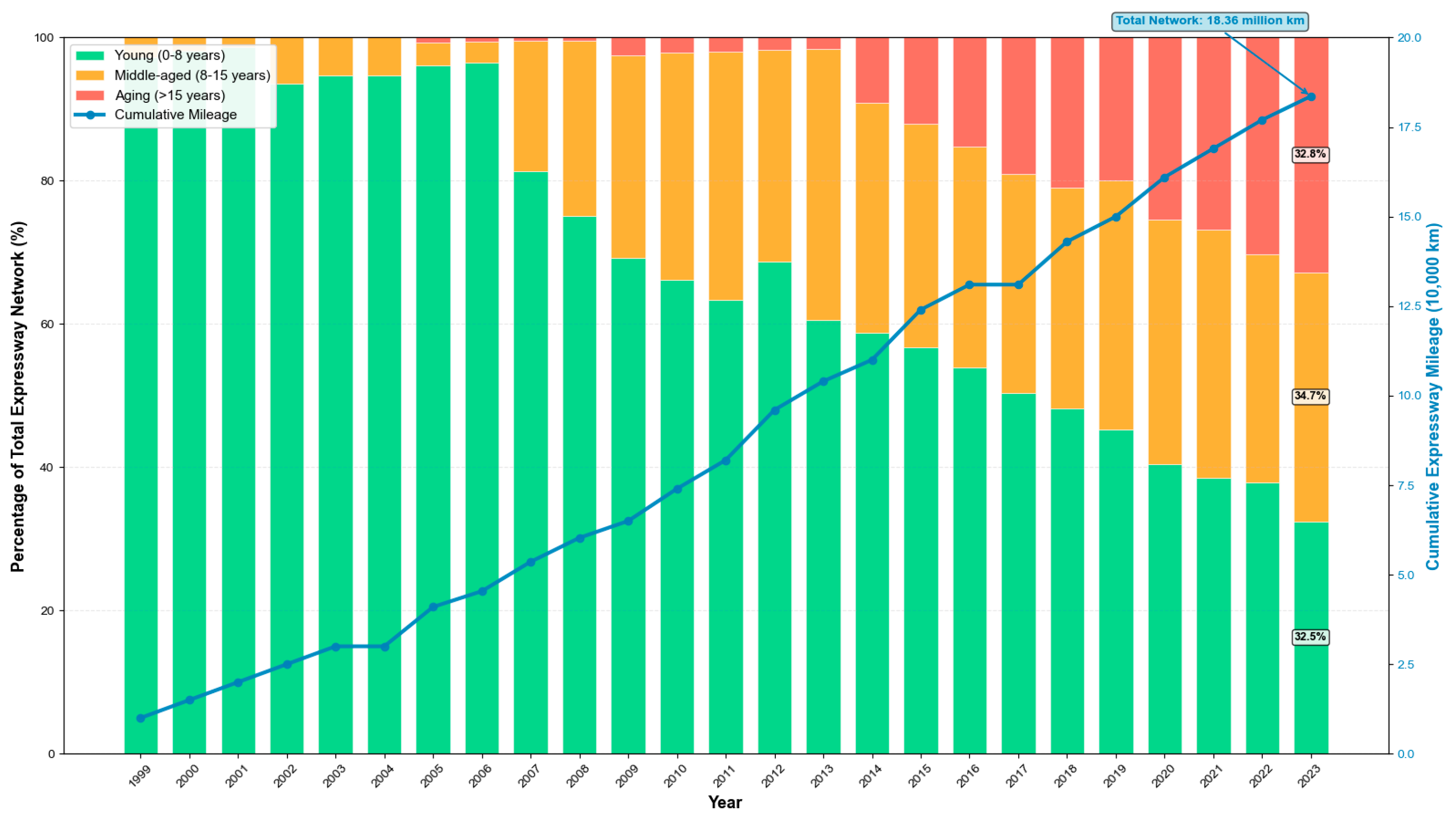 Figure 1. China’s expressway network: aging infrastructure vs. mileage growth (1999–2023).