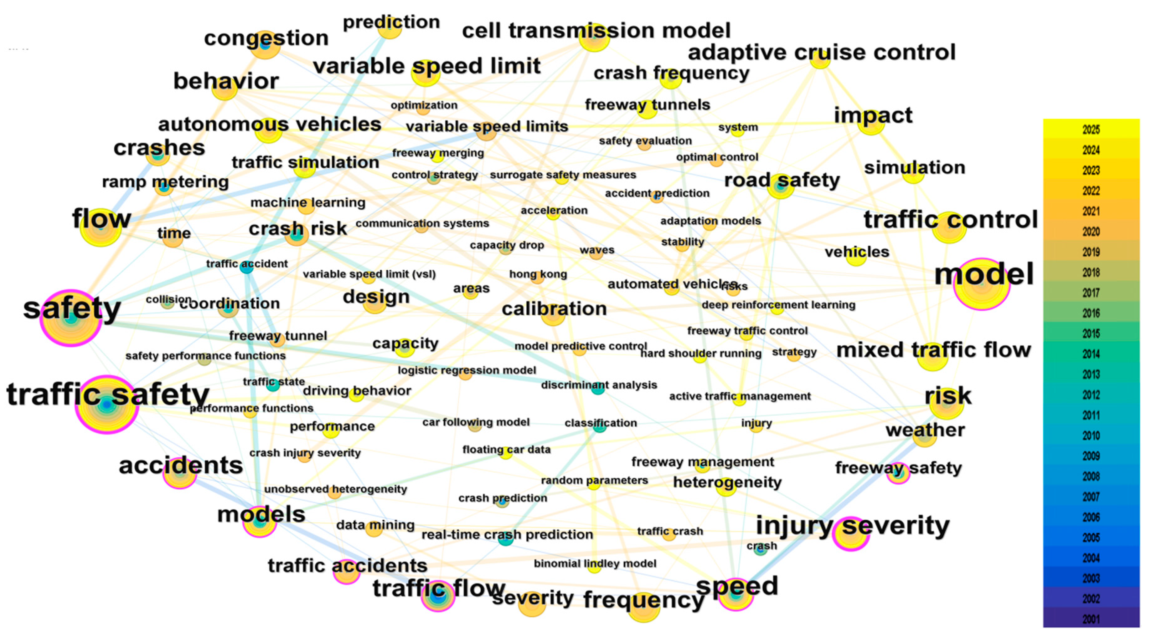 The network layout, shown in Figure 2, was optimized using CiteSpace’s built-in force-directed layout algorithm, which spatially groups tightly interconnected keywords. Community detection was performed using the Log-Likelihood Ratio (LLR) algorithm to identify distinct research clusters, which were color-coded. Node size is proportional to the weighted degree centrality, reflecting a keyword’s frequency and co-occurrence strength. This visualization reveals the complex interplay between core themes such as “variable speed limits,” “accident risk,” and “traffic flow characteristics,” underscoring the field’s emphasis on integrated theoretical modeling and risk assessment.