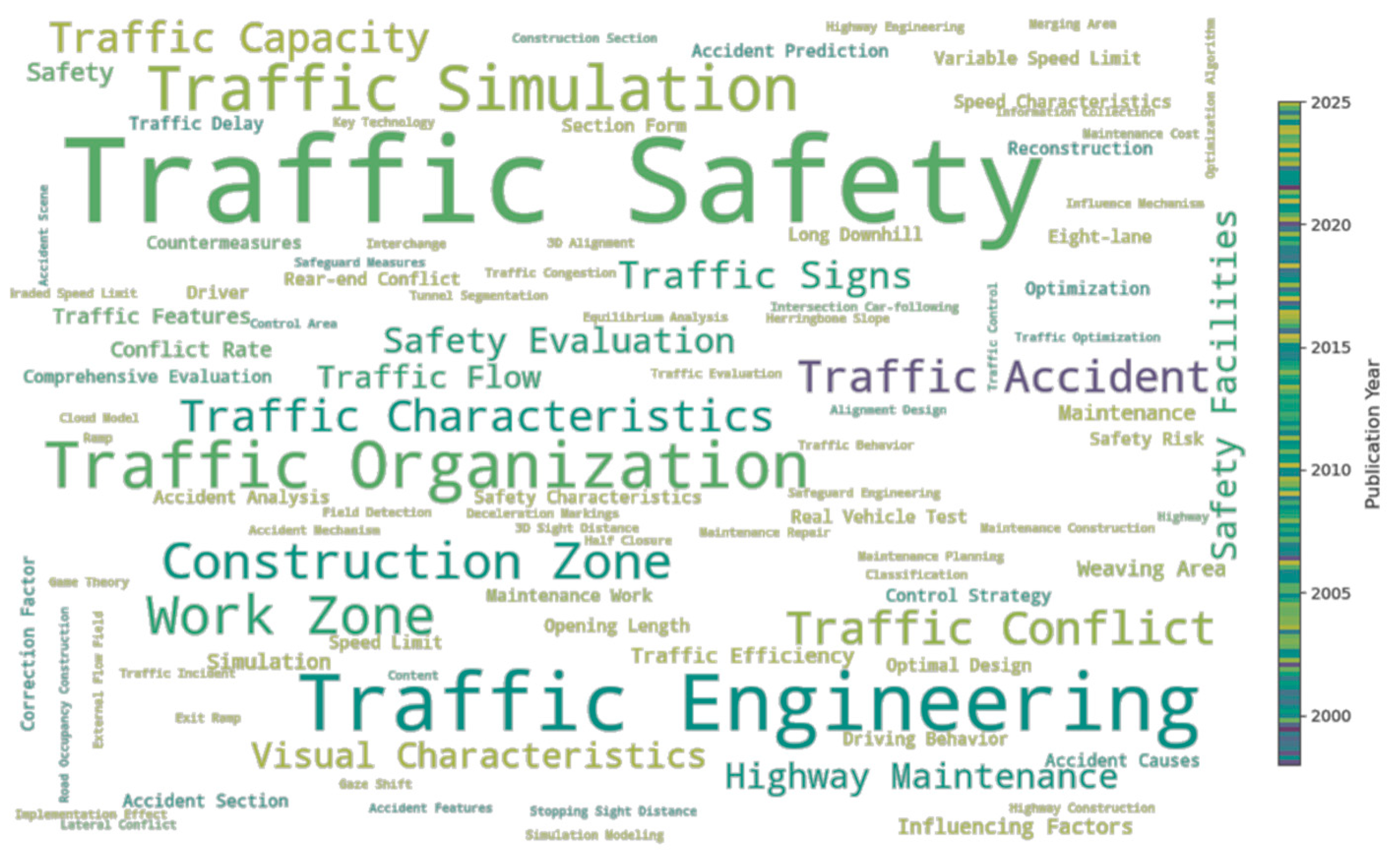 Meanwhile, the keyword cloud diagram, shown in Figure 3, vividly illustrates the major research focuses on traffic safety of expressway maintenance road sections in China. Among these, “traffic safety” appears as the most prominent core keyword, while terms such as “traffic accident,” “traffic engineering,” “traffic simulation,” and “construction area” also stand out with high visibility. These indicate that Chinese research primarily concentrates on accident mechanism analysis, construction safety management, and traffic organization optimization.