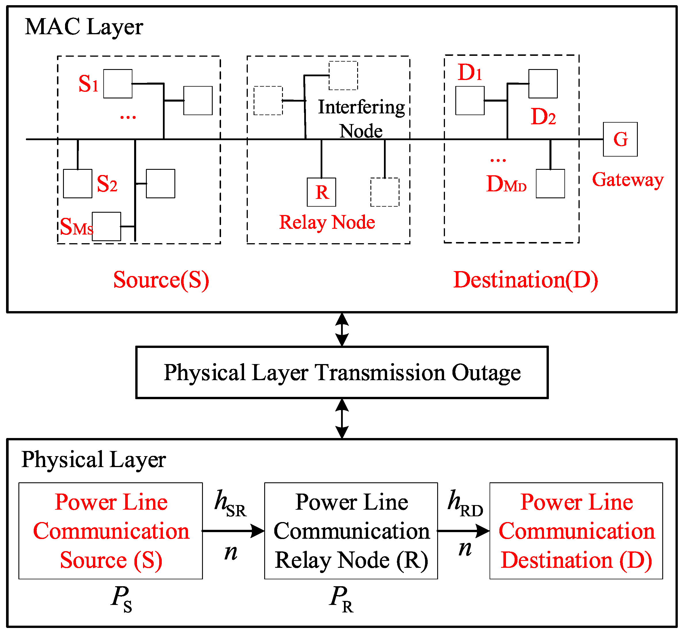 Figure 1 illustrates the cross-layer performance analysis model of the two-hop relay power line communication (PLC) system. At the physical layer, a typical three-node model is adopted, consisting of a source node (S), a destination node (D), and a relay node (R), operating under a two-slot, half-duplex relay scheme. Power line communication is performed between the source S and relay R, and between the relay R and destination D. The PLC channel considers log-normal fading (logarithmic normal distribution, LgN-D) and Bernoulli–Gaussian noise to capture realistic channel impairments. The source node S contains M S nodes S = S 1 , S 2 , , S M S , the destination node D contains M D nodes D = D 1 , D 2 , , D M D , and within the listening range of relay node R there are M R 1 interference nodes randomly distributed within a defined area. The relay node R does not generate its own data packets but serves solely to forward packets between the source and destination. Specifically, the source node S sends packets containing the destination address to relay R. Upon receiving the packets, relay R verifies the destination address and then forwards the packets accordingly. Finally, the destination node D receives the relayed packets, completing the two-hop communication process.