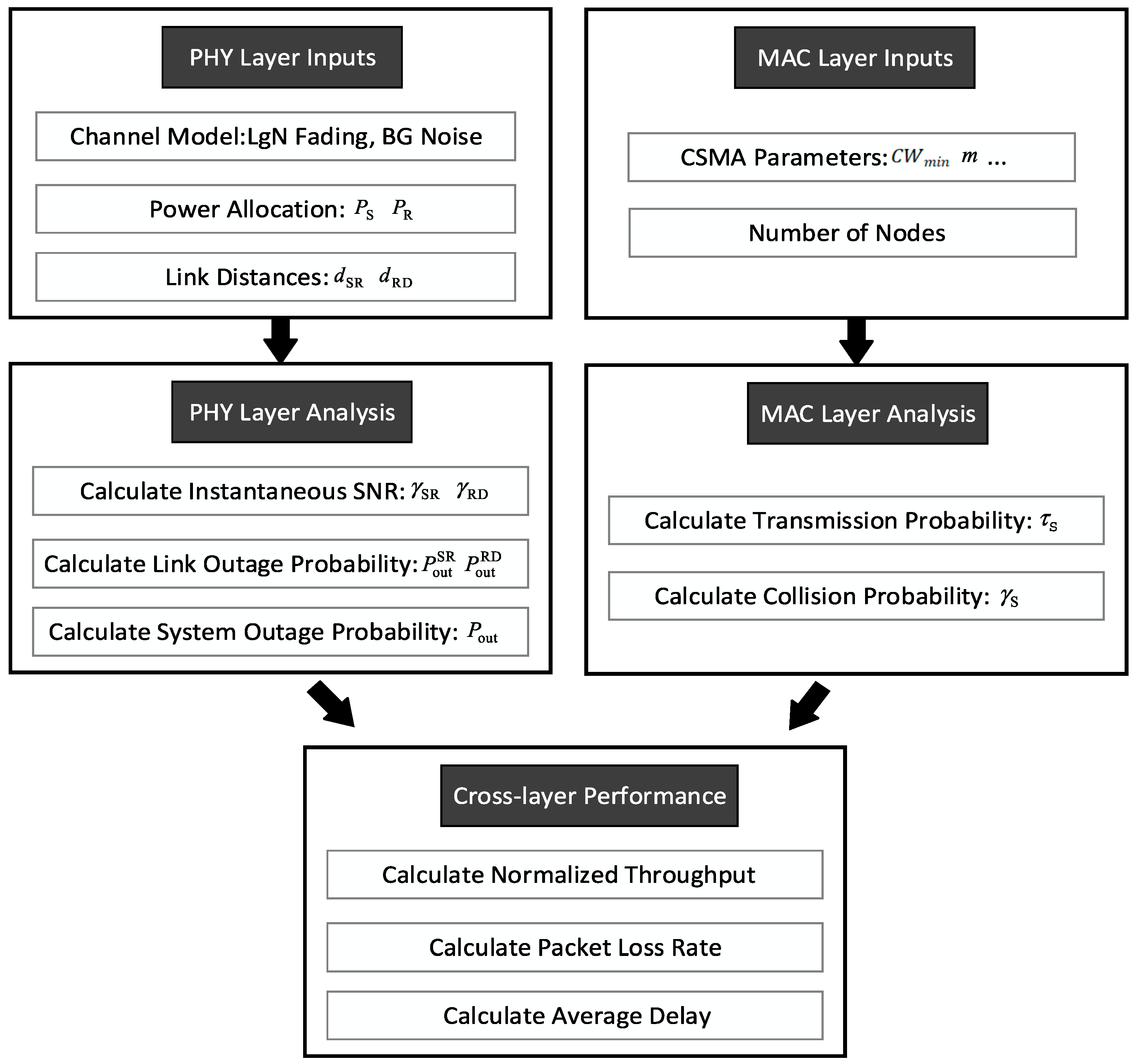 Figure 2 logically divides the functional modules of the two-hop PLC relay system: the physical layer is responsible for channel modeling and outage analysis, the MAC layer focuses on protocol parameter configuration and collision calculation, and the cross-layer module integrates data from both layers to derive key performance metrics. This diagram lays a graphical foundation for the cross-layer performance analysis in Section 3.